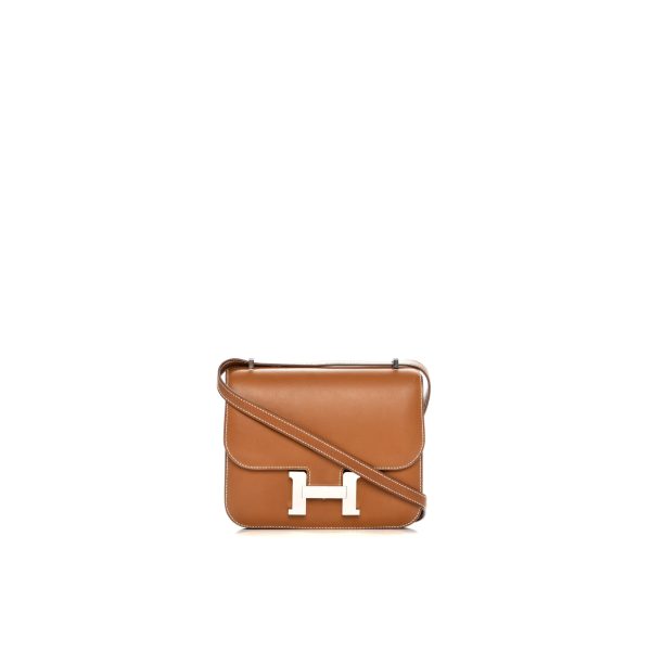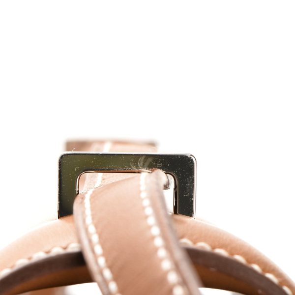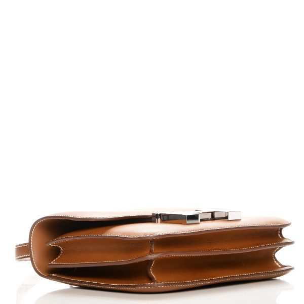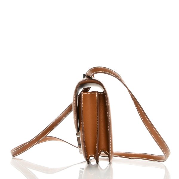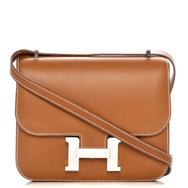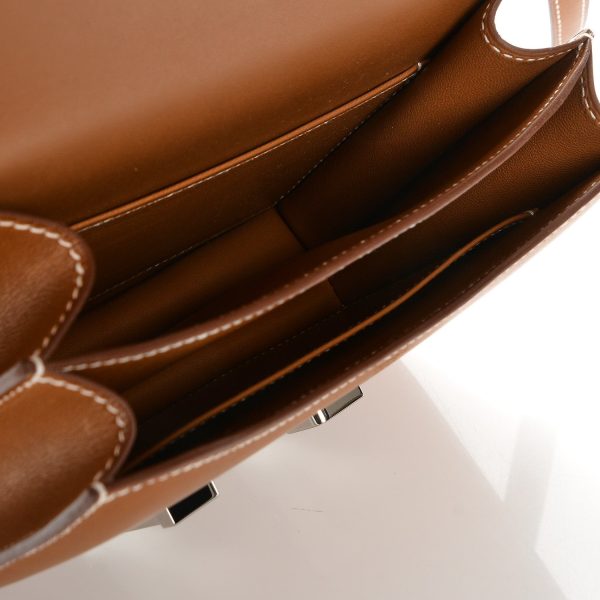 This Constance is in Barenia Fauve with palladium hardware, has tonal stitching, a metal “H” snap lock closure and adjustable shoulder strap. The interior is lined with Goat lambskin and has an open pocket on the front wall, a center divide.