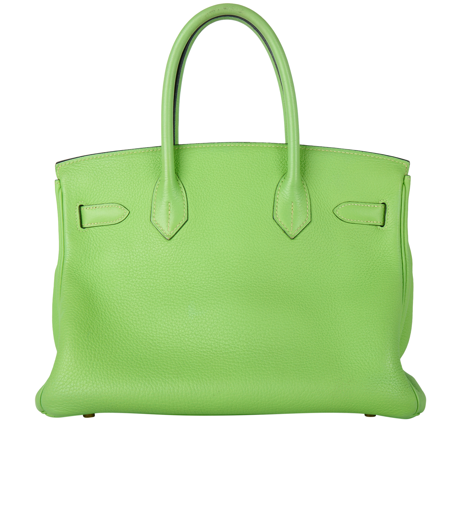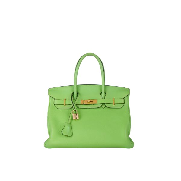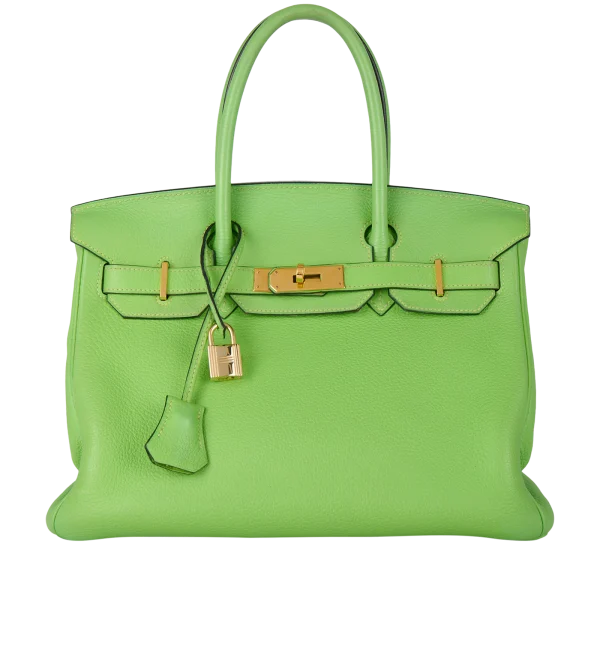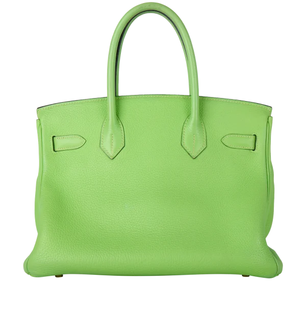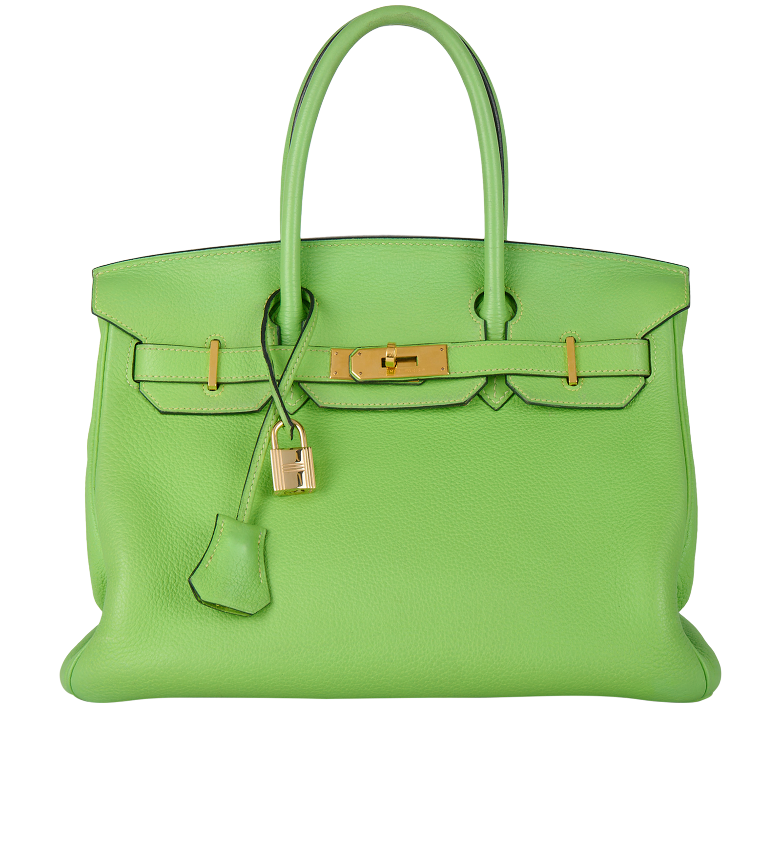 This BK is in Apple Green togo leather with Gold hardware, has tonal stitching, front flap, two straps with center toggle closure, clochette with lock and two keys, and double rolled handles.