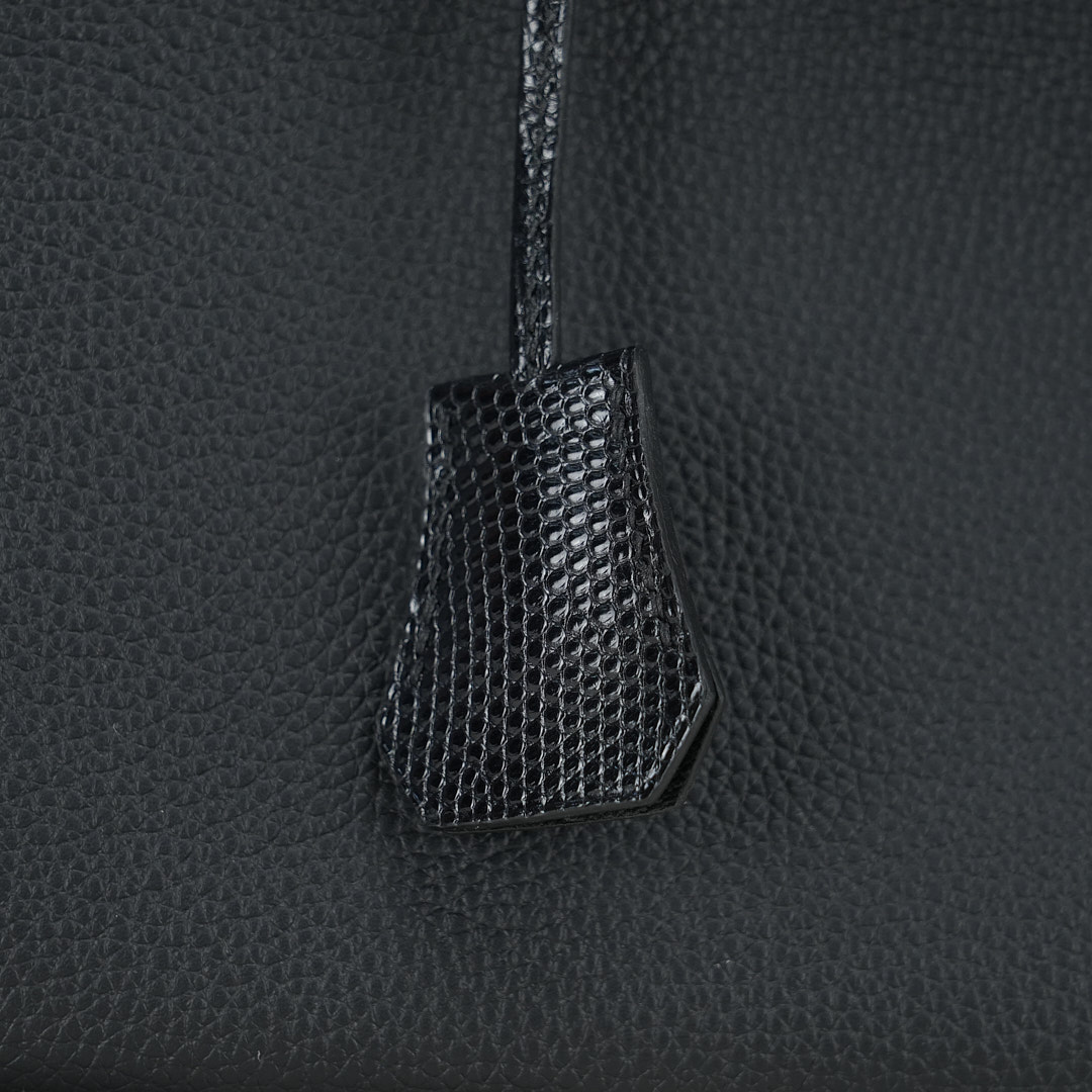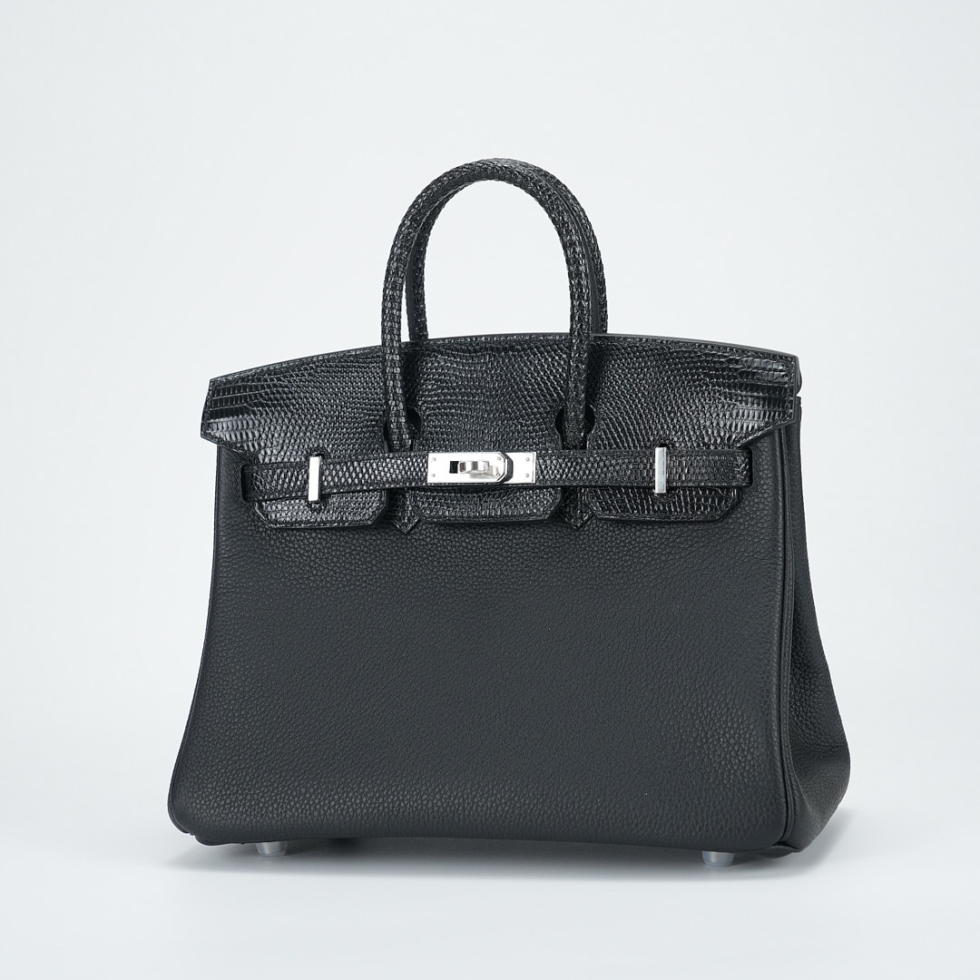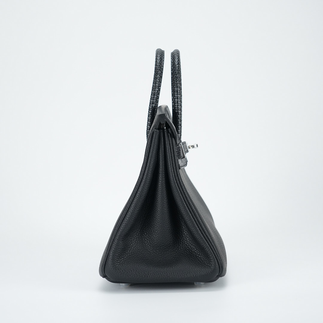 This BK is in Black Lizard and Togo leather with Palladium hardware and has tonal stitching, front strap, two straps with center toggle closure, clochette with lock and two keys and double rolled handles.