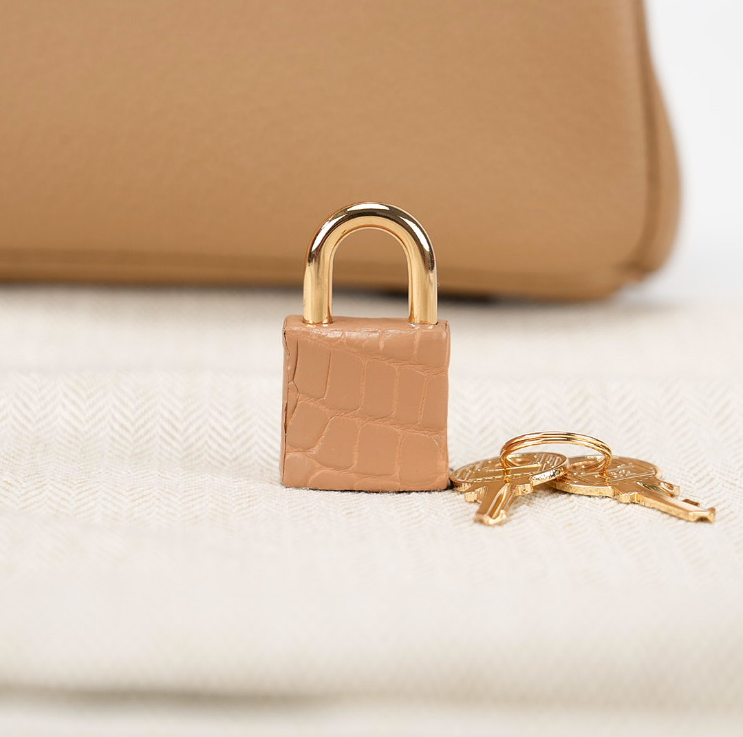 This BK is in Chai matte Alligator Crocodile and togo leather with Gold hardware and has tonal stitching, front strap, two straps with center toggle closure, clochette with lock and two keys and double rolled handles.