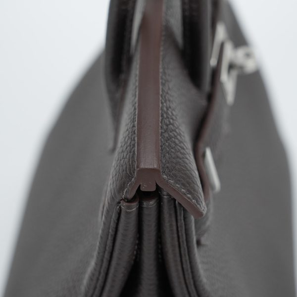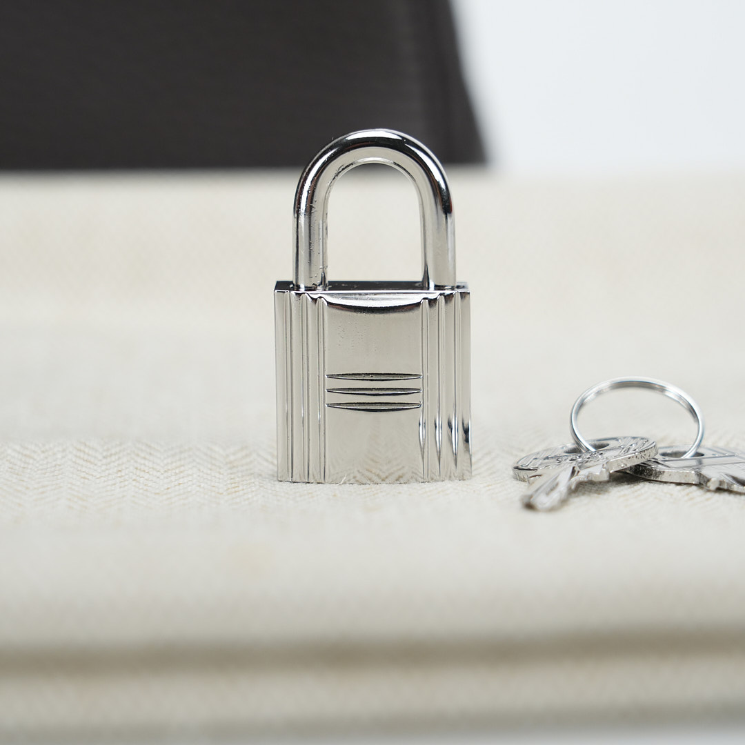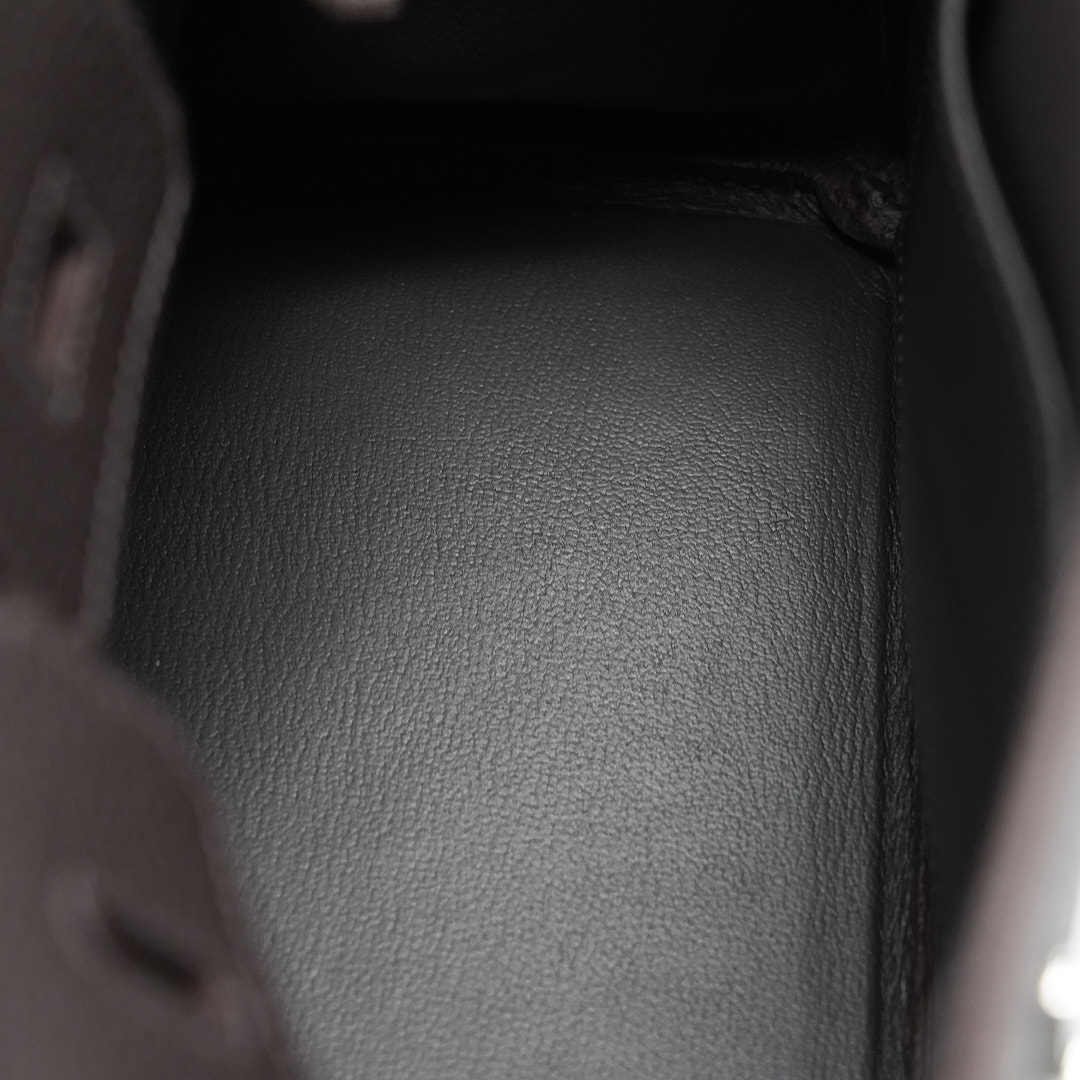 This BK 25 in Vert Bronze. This chic classic handbag is finely crafted of Taurillon Clemence leather in Vert Bronze. It features rolled leather top handles, a front flap, palladium hardware including a turn lock, and a padlock with a hanging clochette for the keys. The top flap opens to a chevre leather interior with zipper and patch pockets.