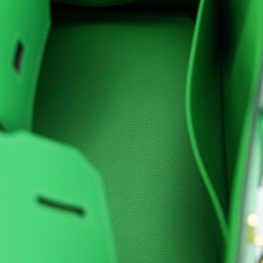This BK is in Bamboo Swift leather with Gold hardware, has tonal stitching, front flap, two straps with center toggle closure, clochette with lock and two keys, and double rolled handles.