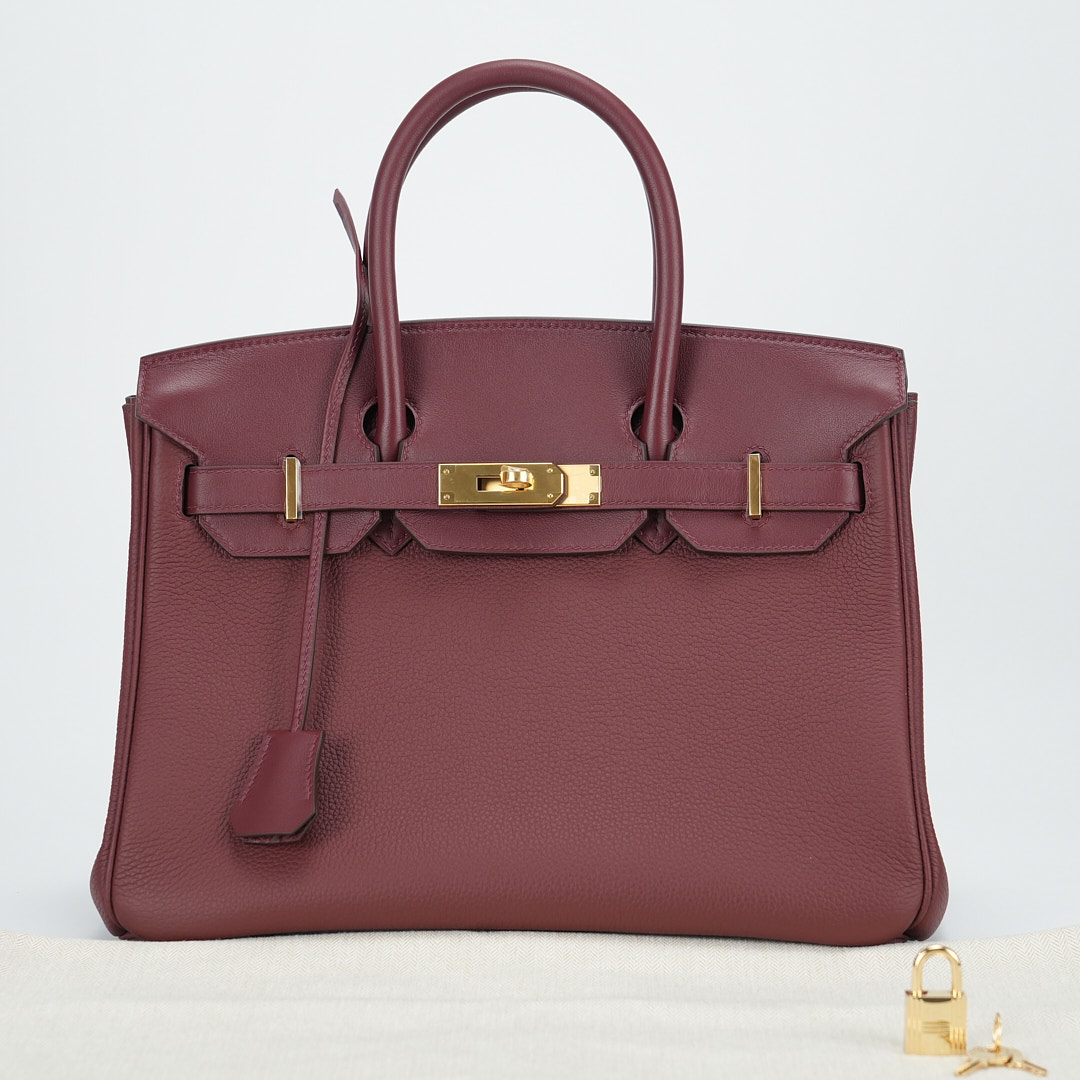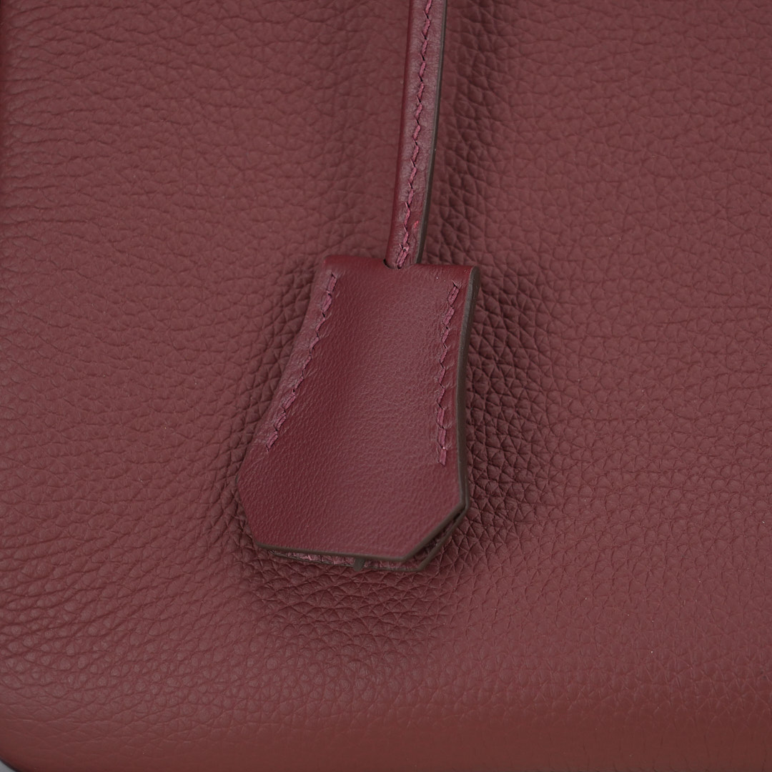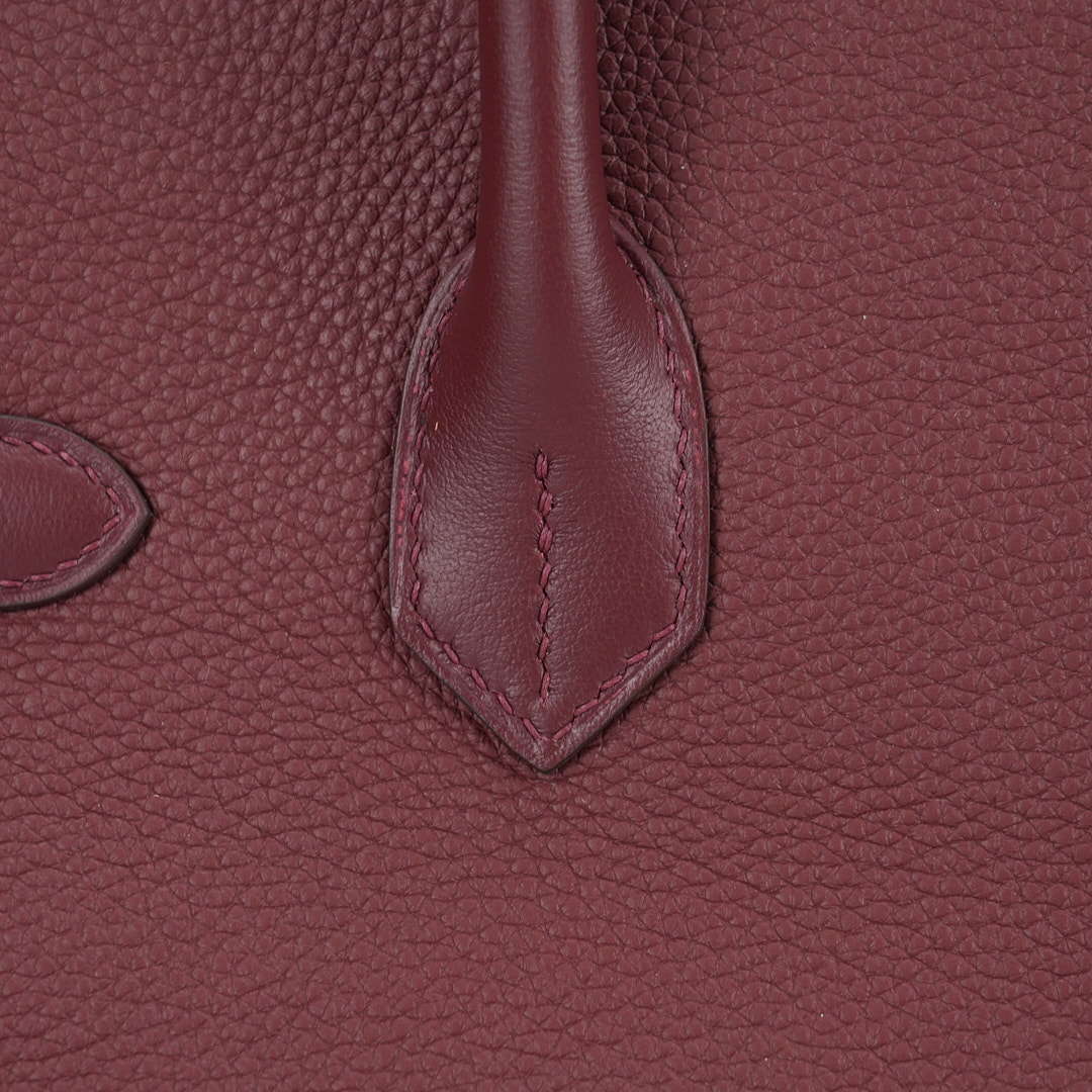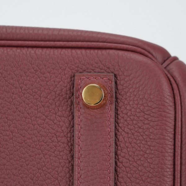 This BK Touch style is in Rouge H Togo leather and Swift leather flap with Gold hardware, has the same tonal stitching, front flap, two straps with center toggle closure, clochette with lock and two keys, and double rolled handles.