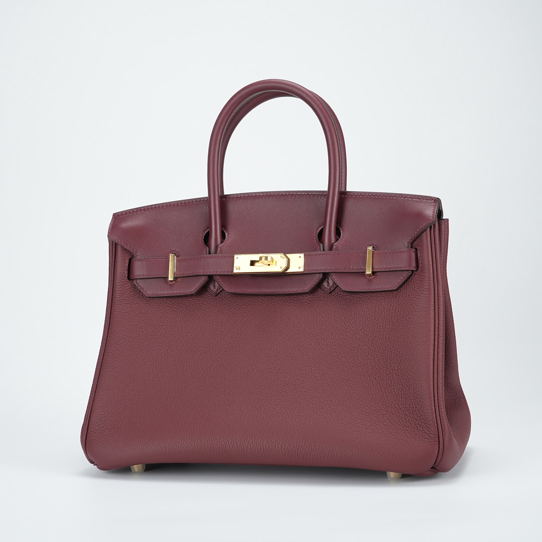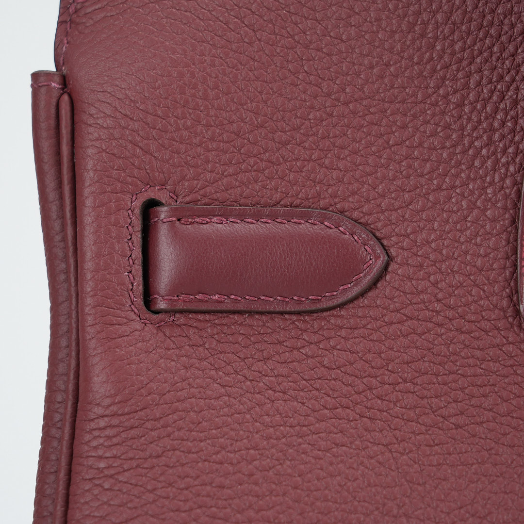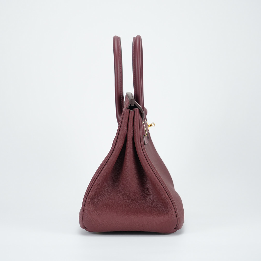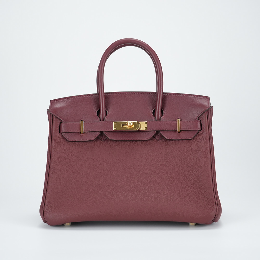 This BK Touch style is in Rouge H Togo leather and Swift leather flap with Gold hardware, has the same tonal stitching, front flap, two straps with center toggle closure, clochette with lock and two keys, and double rolled handles.