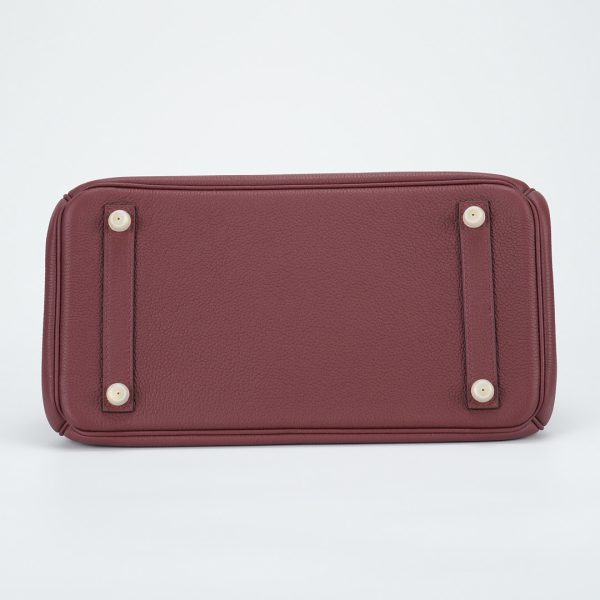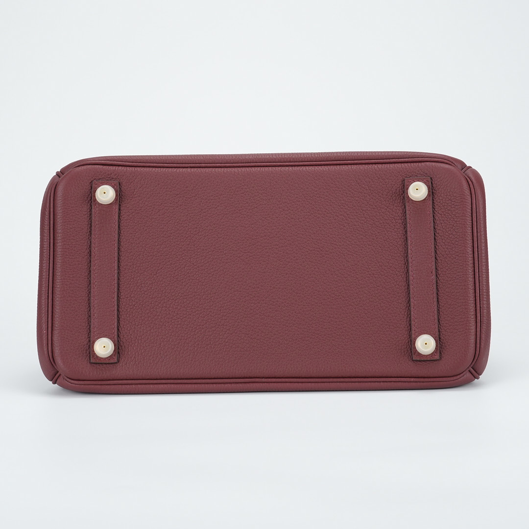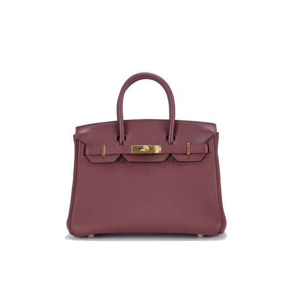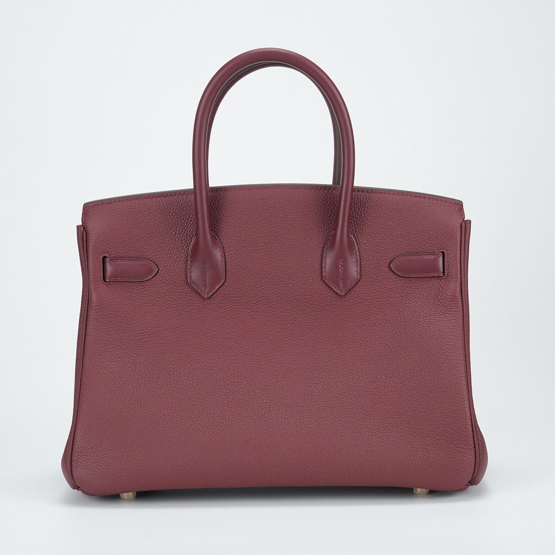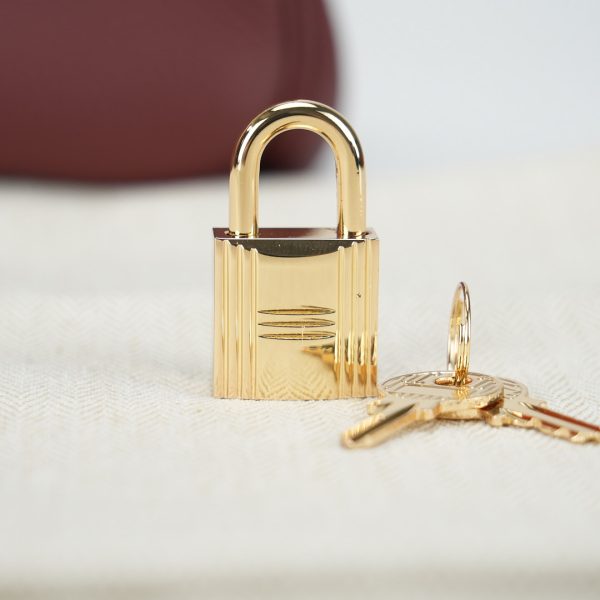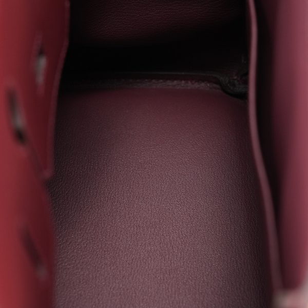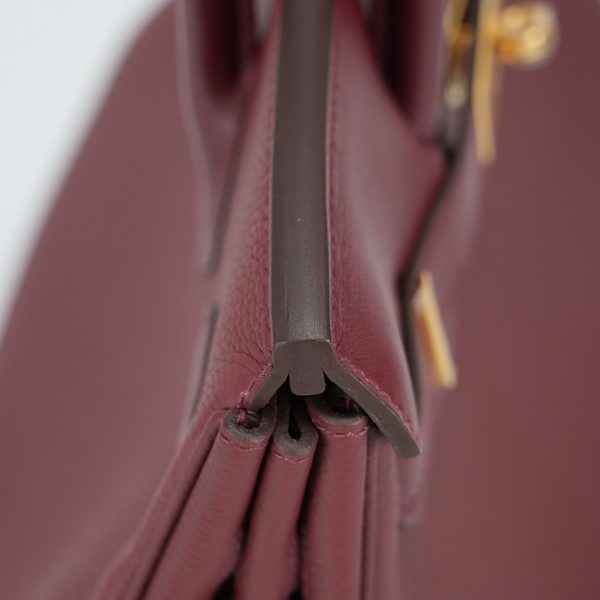 This BK Touch style is in Rouge H Togo leather and Swift leather flap with Gold hardware, has the same tonal stitching, front flap, two straps with center toggle closure, clochette with lock and two keys, and double rolled handles.