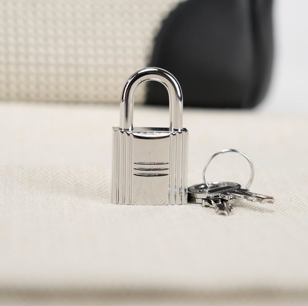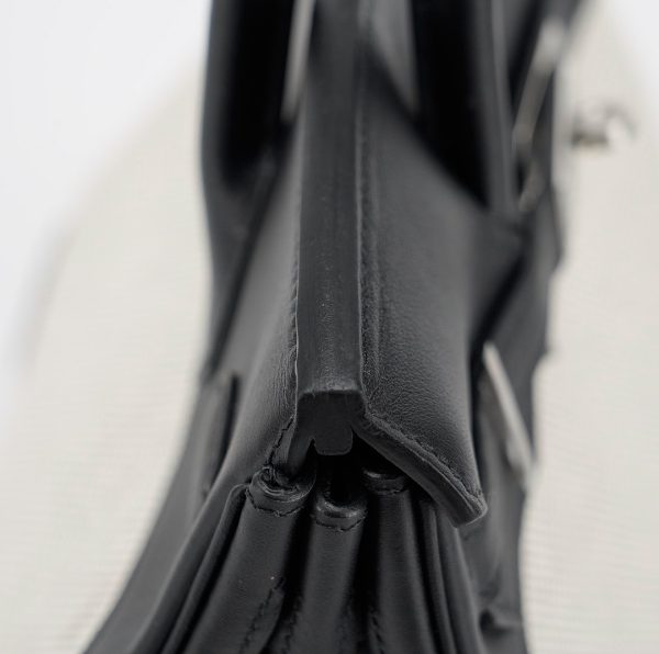 This BK is in Black Swift and Ecru Toile Quadrille with palladium hardware and has same tonal stitching, front flap, two straps with center toggle closure, clochette with lock and two keys, and double rolled handles.