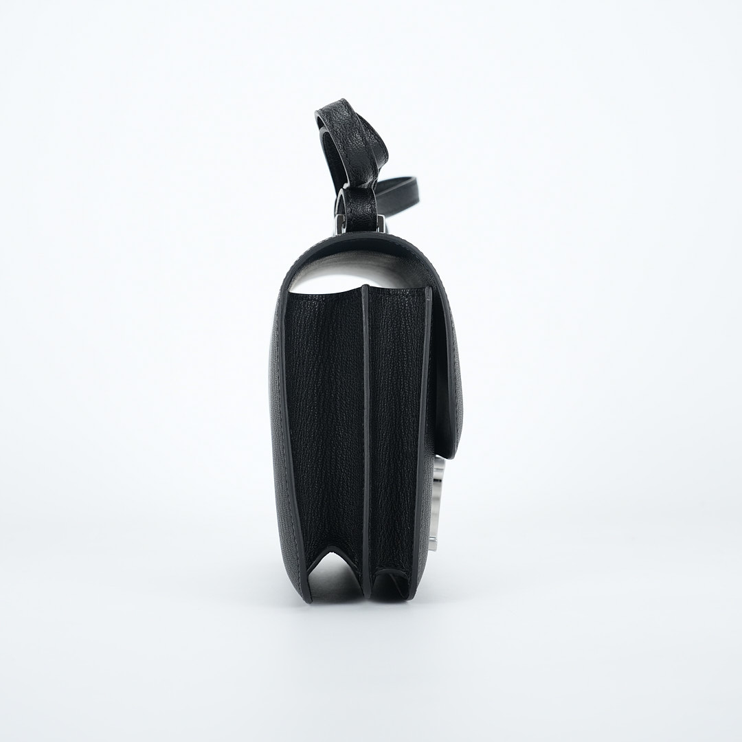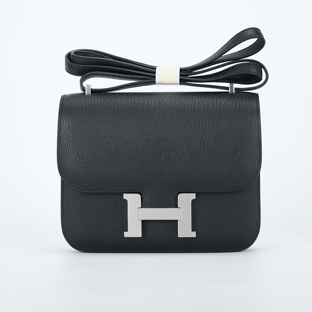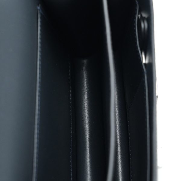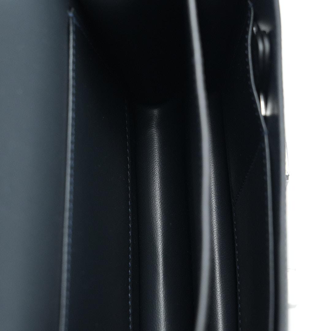This Constance is in Black Chevre with palladium hardware, has tonal stitching, a metal “H” snap lock closure and adjustable shoulder strap. The interior is lined with Blue Nuit lambskin and has an open pocket on the front wall, a center divide.