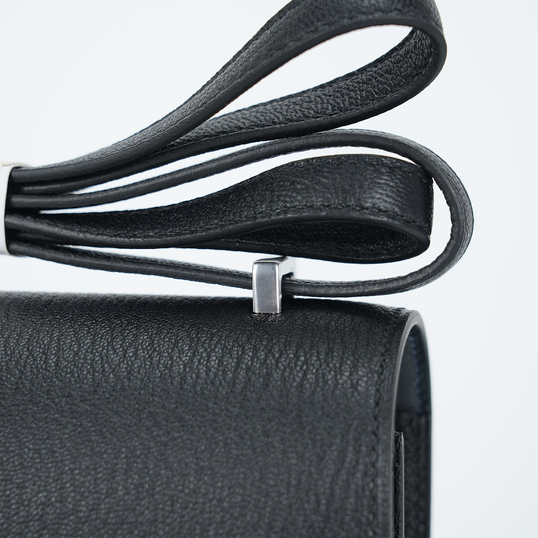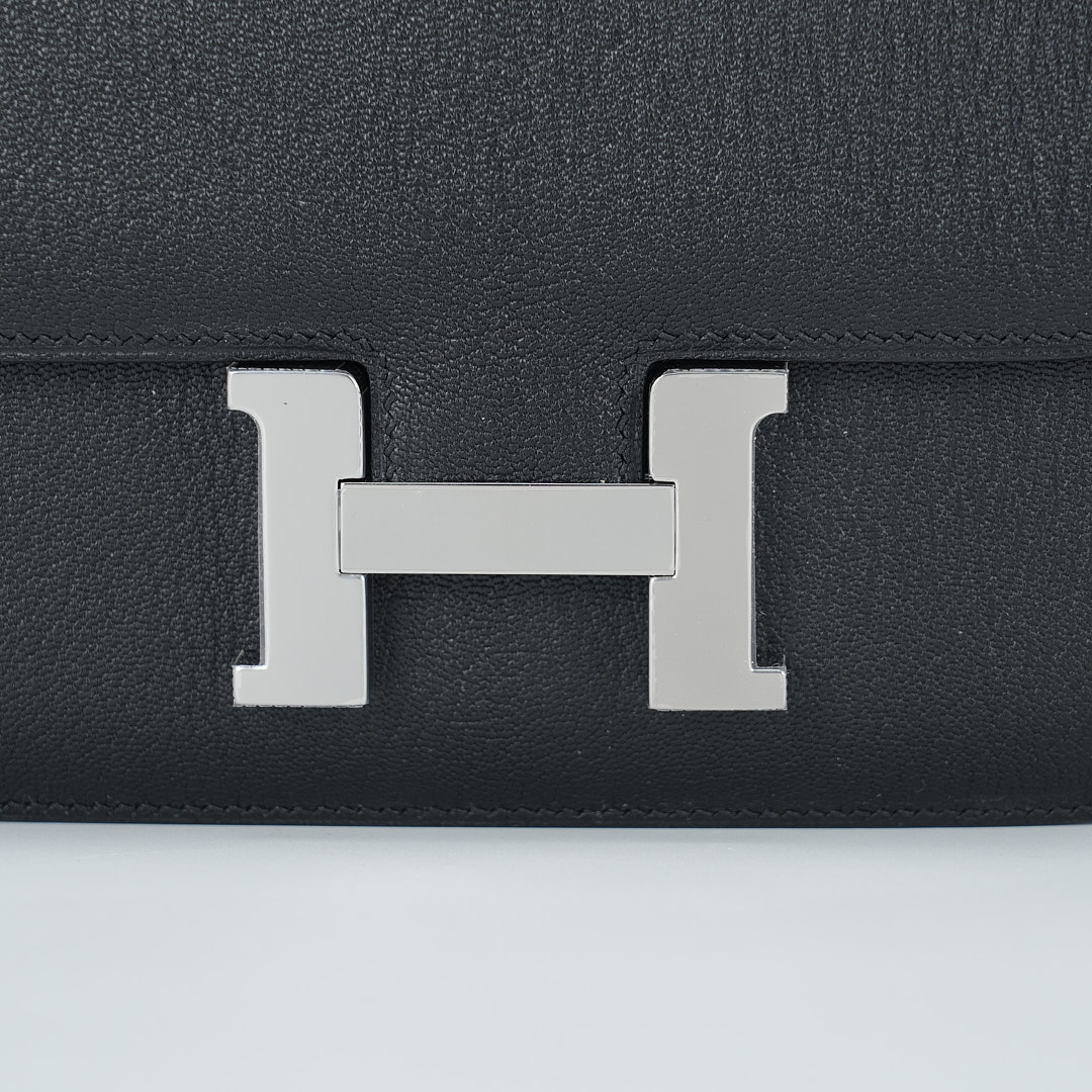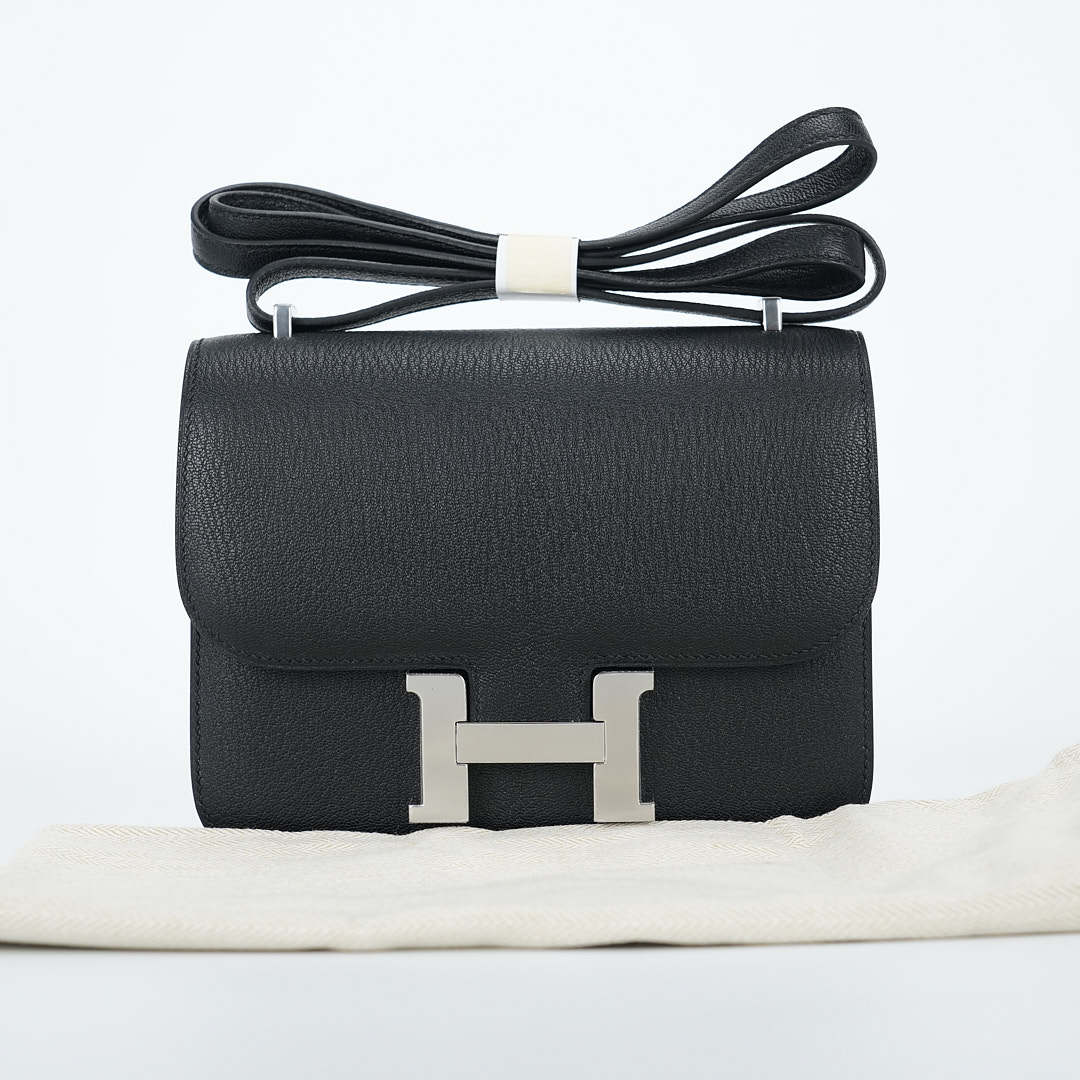 This Constance is in Black Chevre with palladium hardware, has tonal stitching, a metal “H” snap lock closure and adjustable shoulder strap. The interior is lined with Blue Nuit lambskin and has an open pocket on the front wall, a center divide.