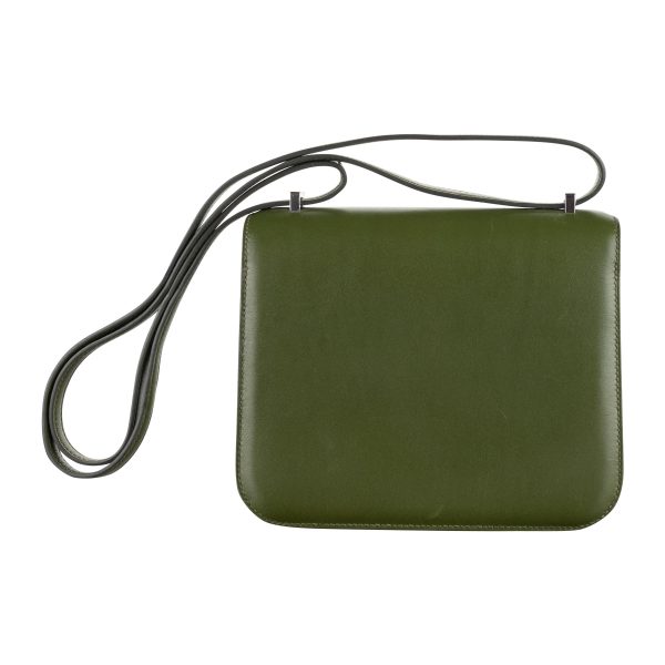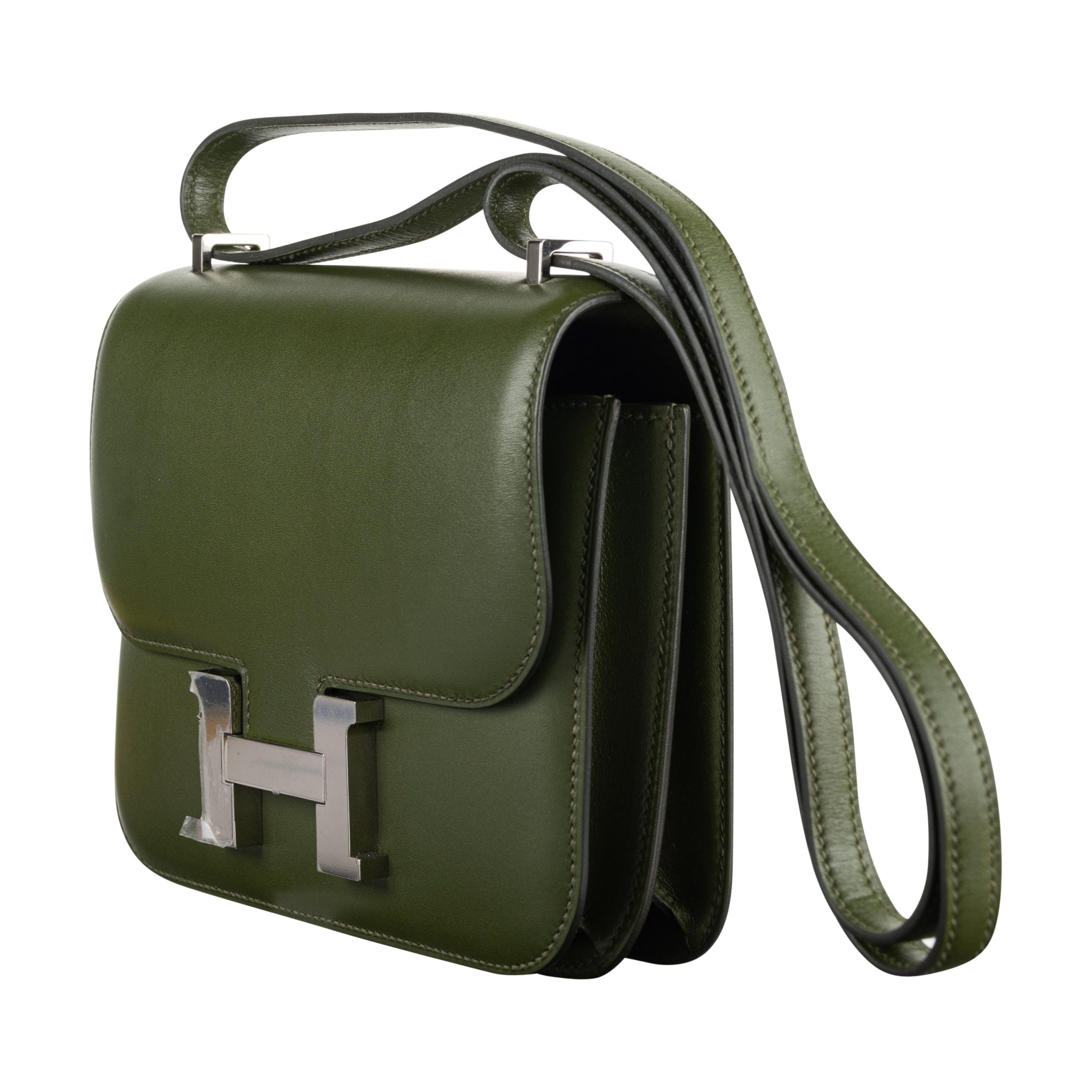 This Constance is in Canopee Swift with palladium hardware, has tonal stitching, a metal “H” snap lock closure and adjustable shoulder strap. The interior is lined with Canopee lambskin and has an open pocket on the front wall, a center divide, and a slit pocket on the back wall.