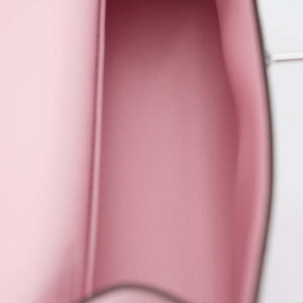 This Constance is of Gris Tourterelle Niloticus with gold hardware and features tonal stitching, a “H” snap lock closure, and a long shoulder strap. The interior is lined with Rose Sakura lambskin and has an open pocket on the front wall, a center divide, and a slit pocket on the back wall.
