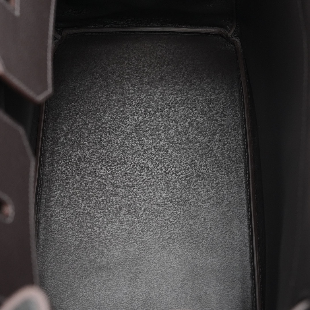 This is a Evergrain HAC BK 40 in Ebene. This spacious travel tote is crafted of fine Evergrain leather in burgundy with expansive sides and a durable reinforced base. The bag features rolled leather top handles and a cross over flap with straps and a palladium plated turn lock closure. This opens to a matte chèvre goatskin leather interior.