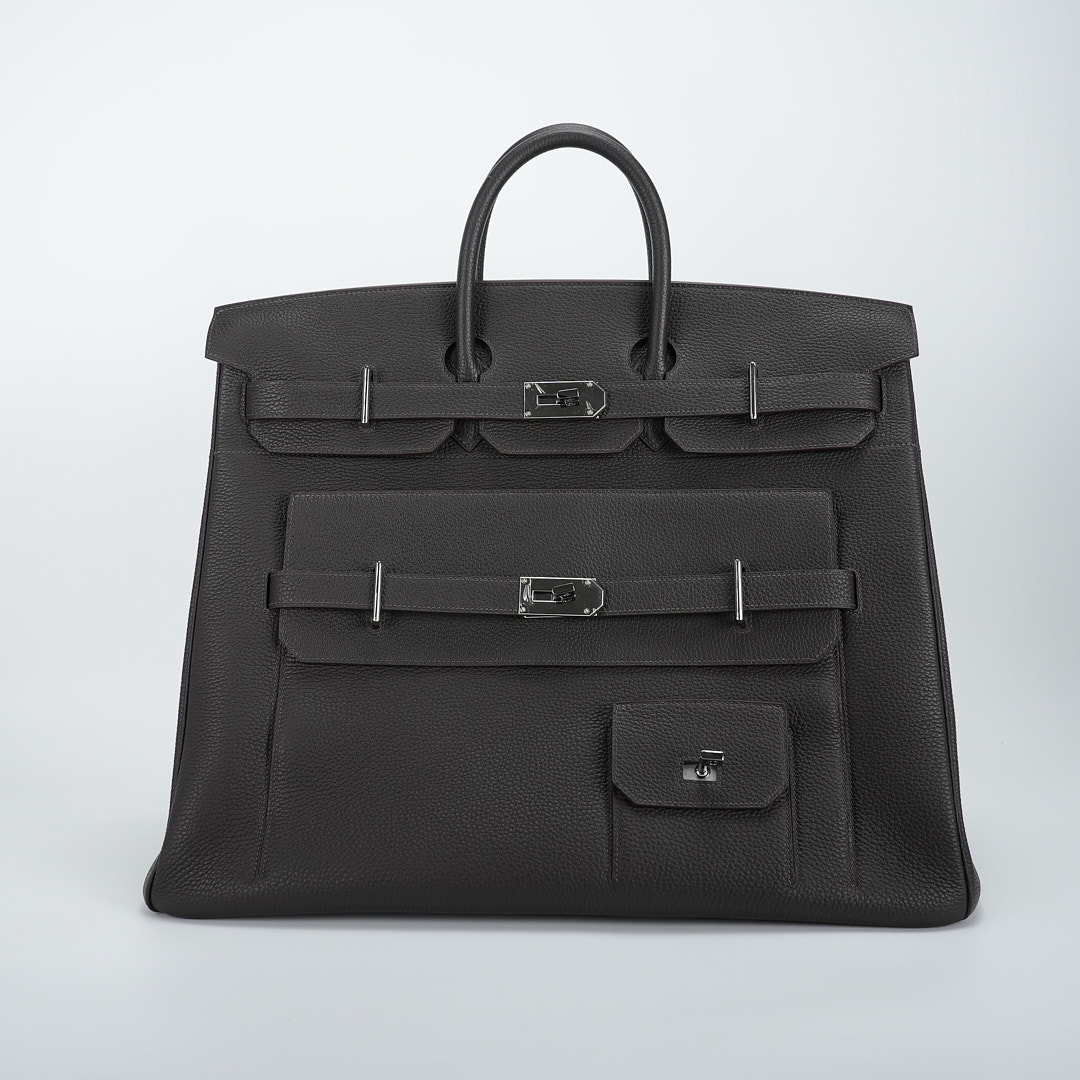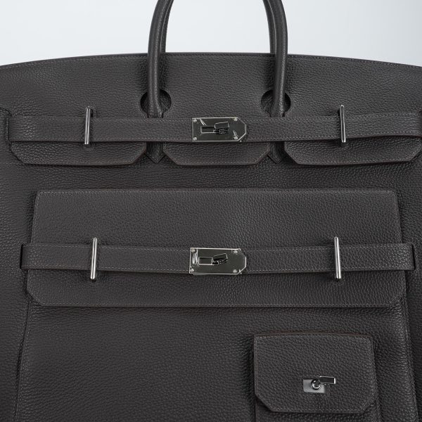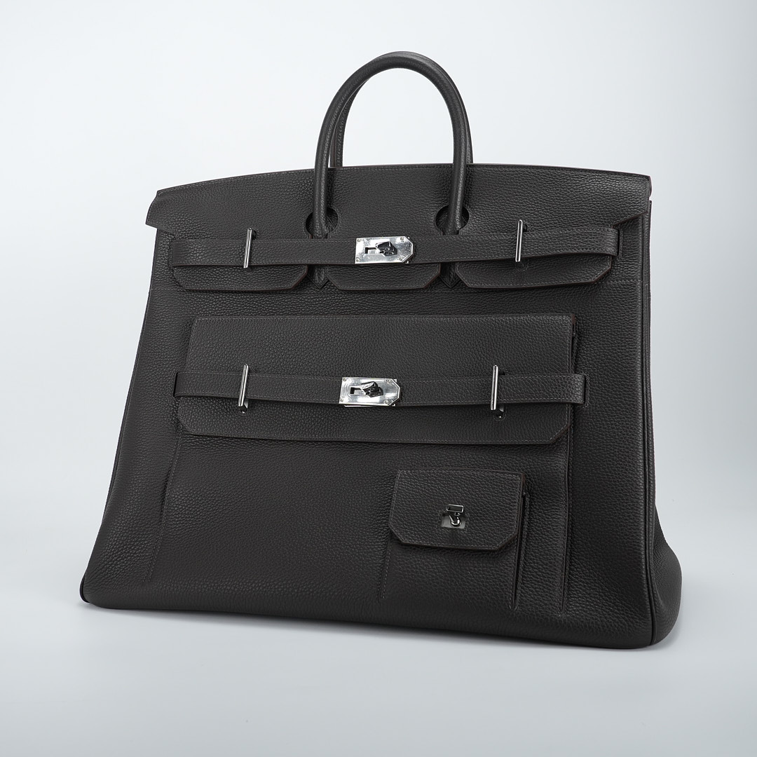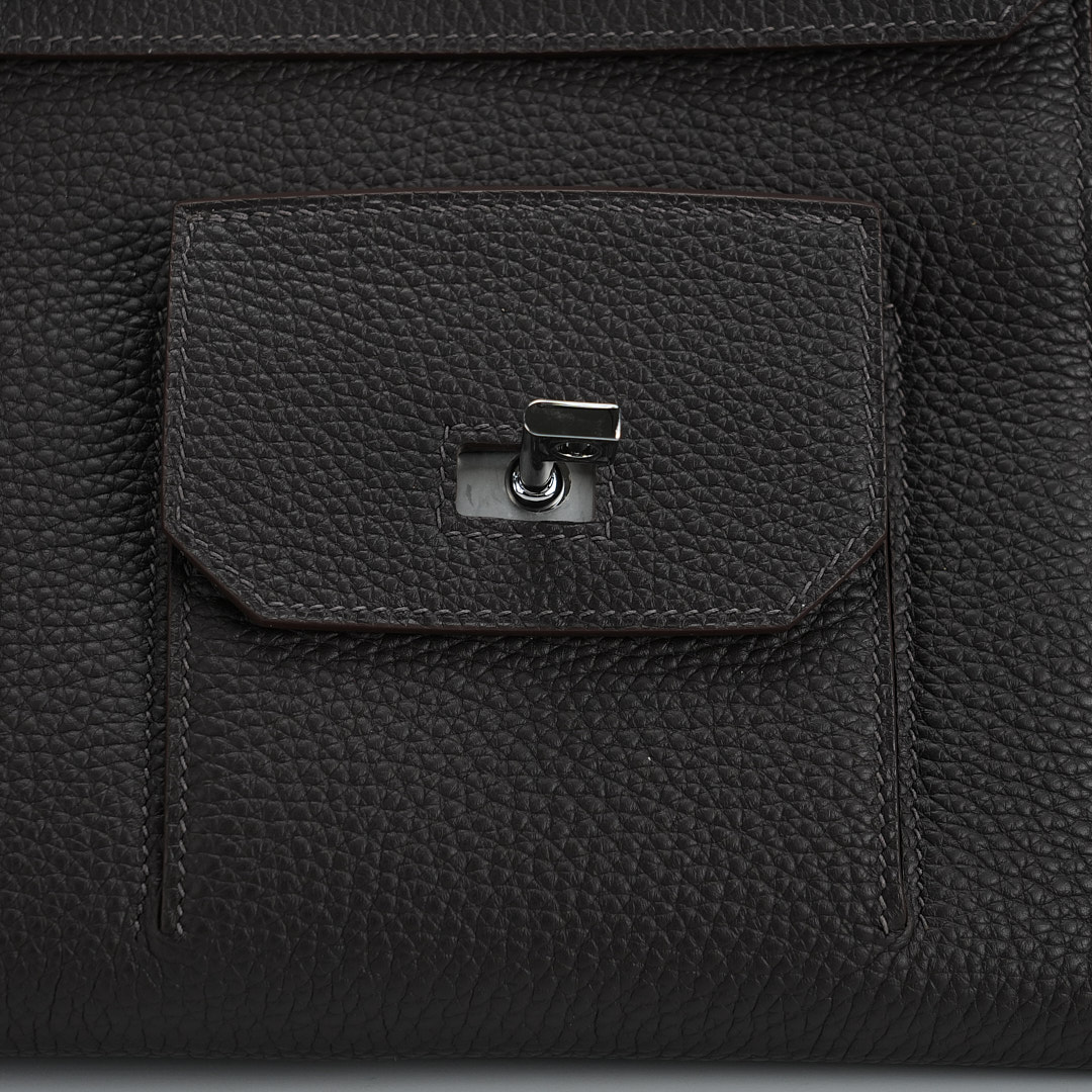 Embrace timeless elegance with this Ecorce Café Multi-Pockets 50 in Taurillon Clemence leather. This spacious bag pays homage to equestrian heritage while meeting modern lifestyle needs.