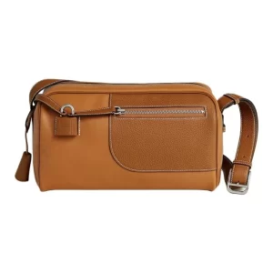 Bag in Evercolor calfskin and taurillon Clemence leather with adjustable shoulder strap, zipped front pocket and leather-covered lock closure. Inspired by photographers’ bags featuring multiple pockets, this line introduces a new style and gives the lock closure a signature role on the front of the bag. Loops allow for a short or long carry.