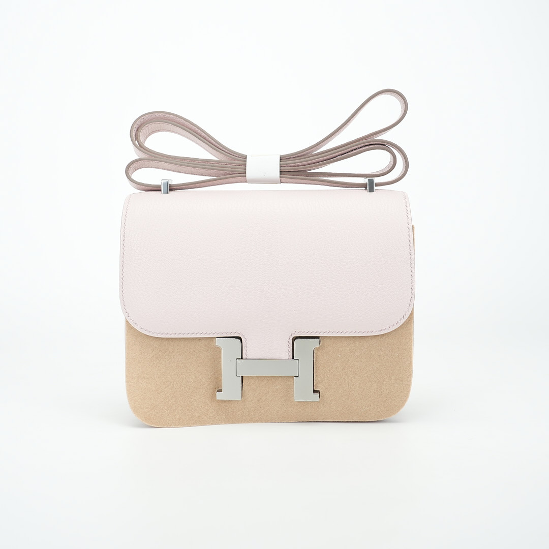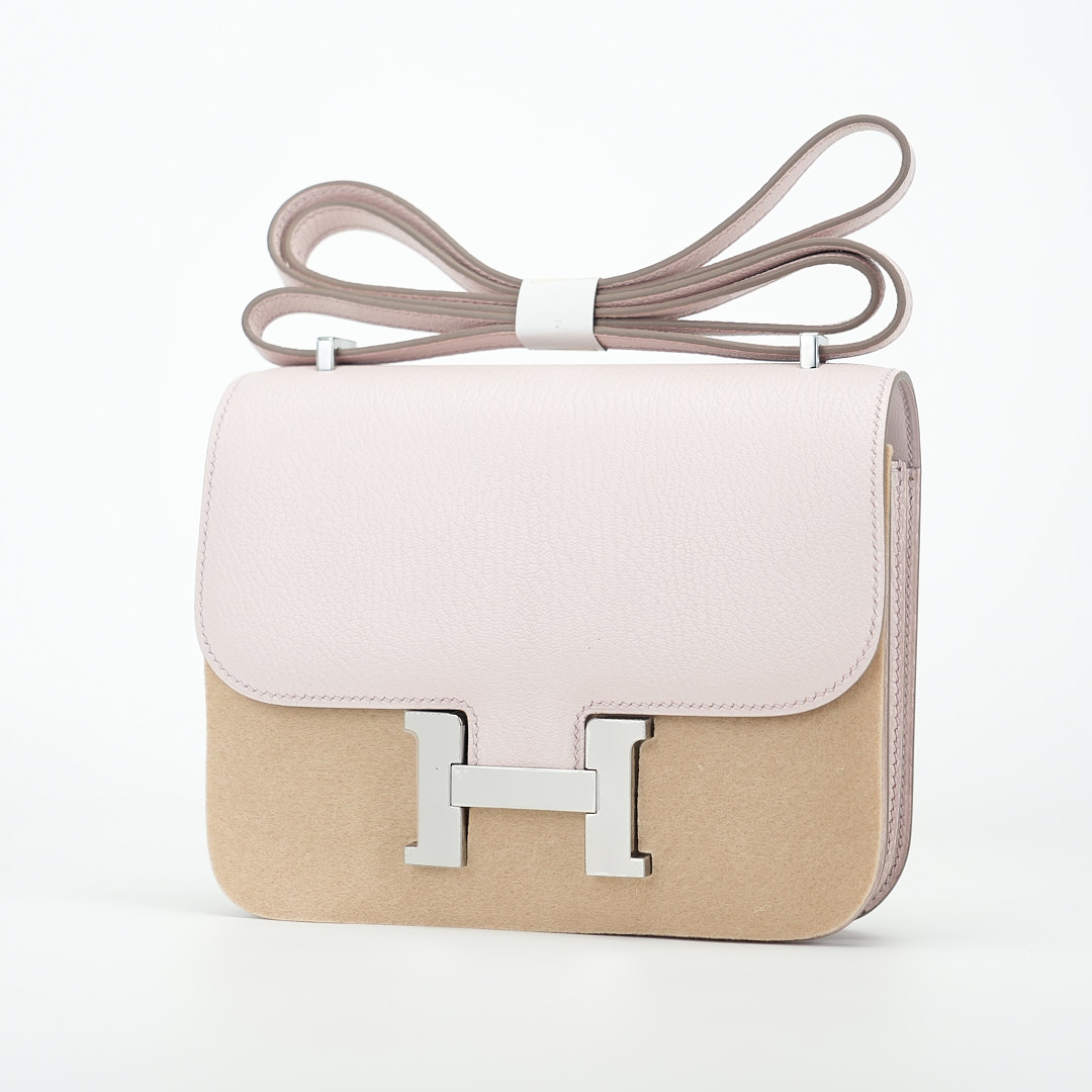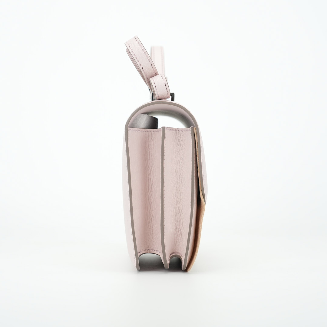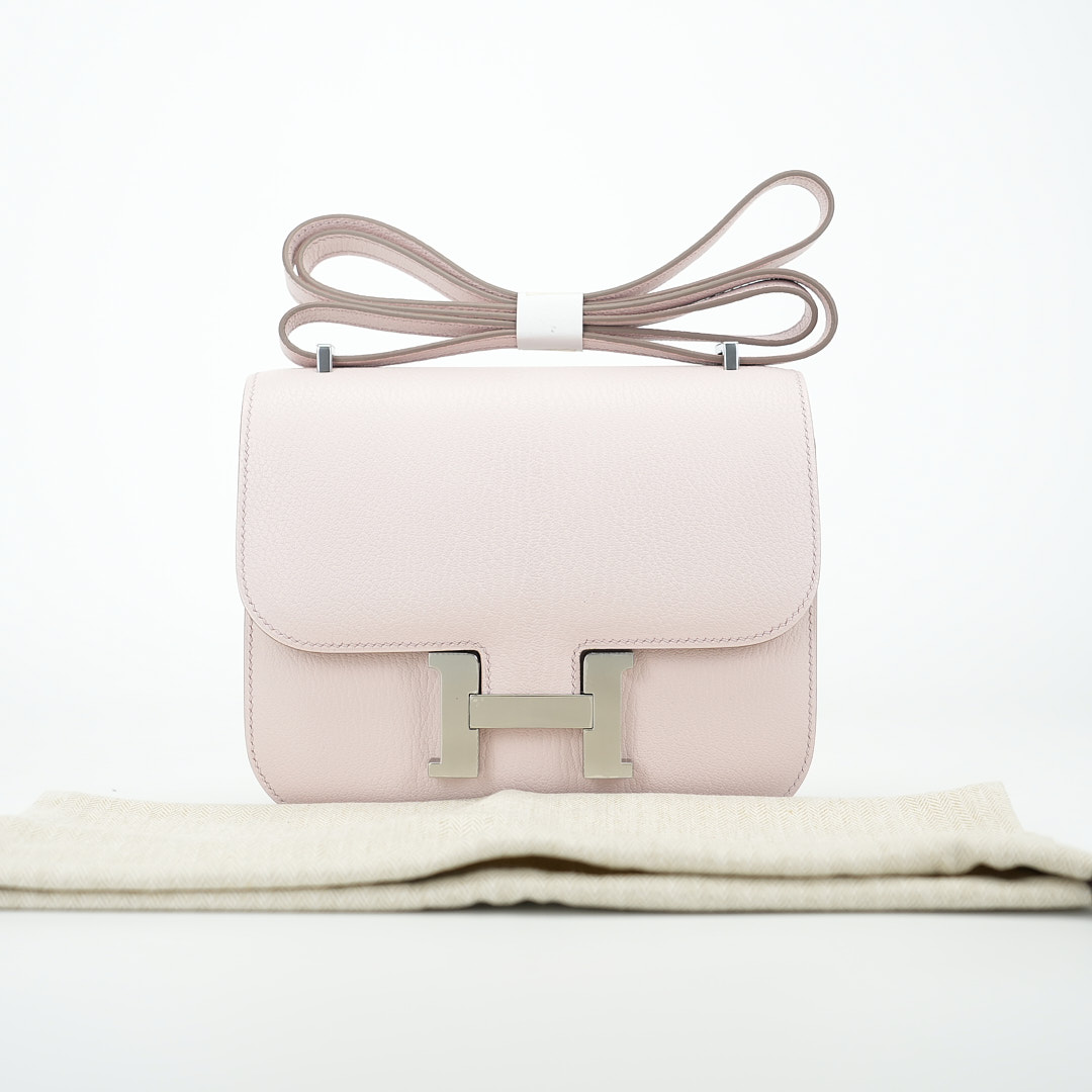 This Constance is in Rose Darling Chevre with palladium hardware, has tonal stitching, a metal “H” snap lock closure and adjustable shoulder strap. The interior is lined with Goat lambskin and has an open pocket on the front wall, a center divide.