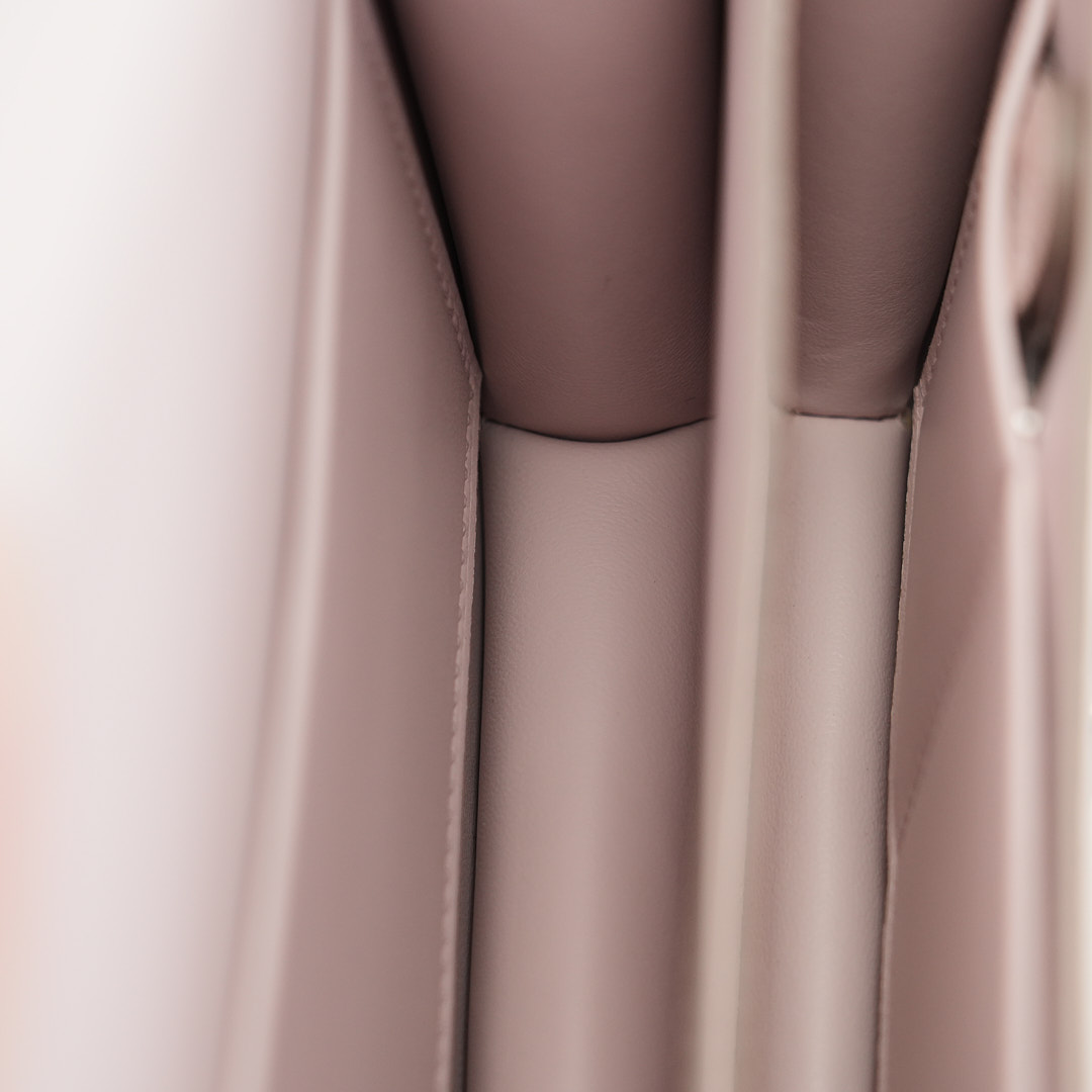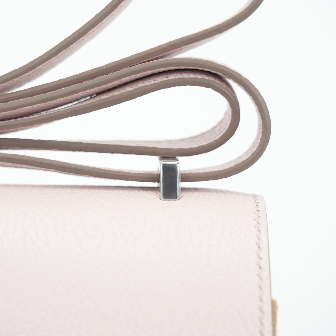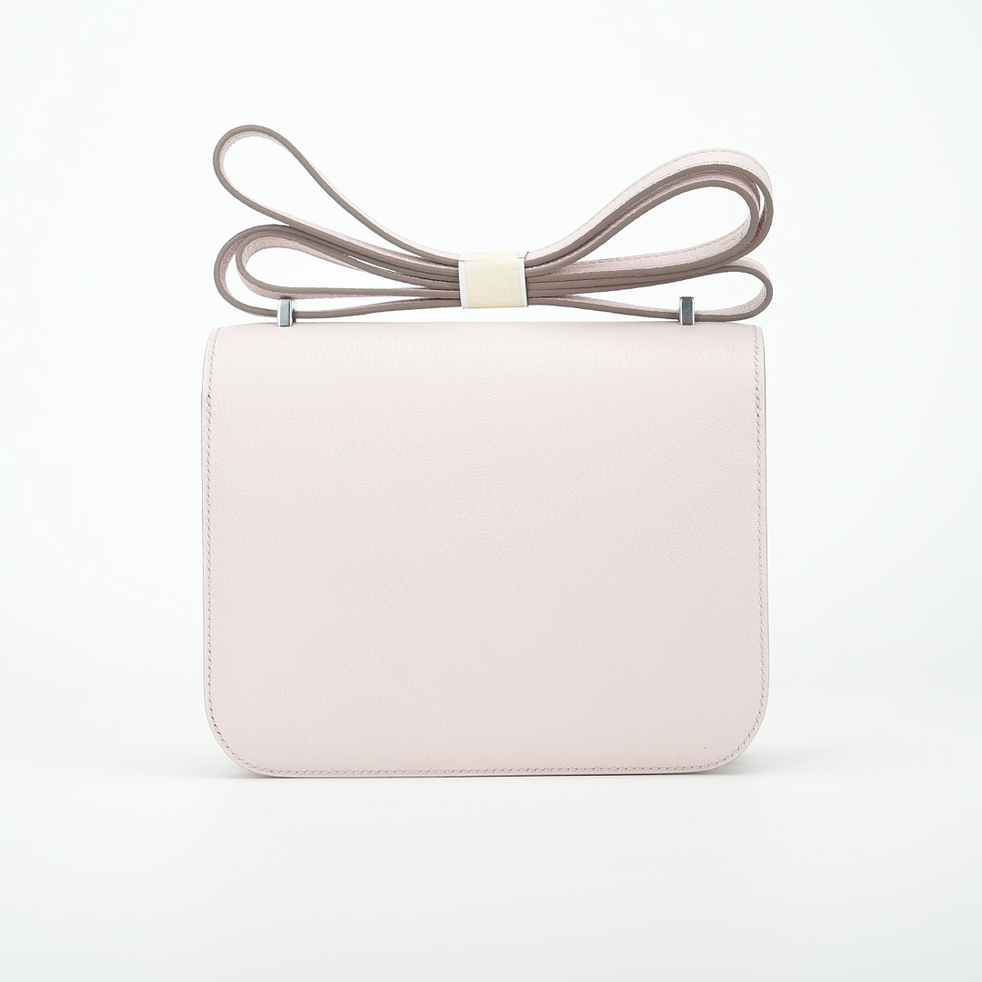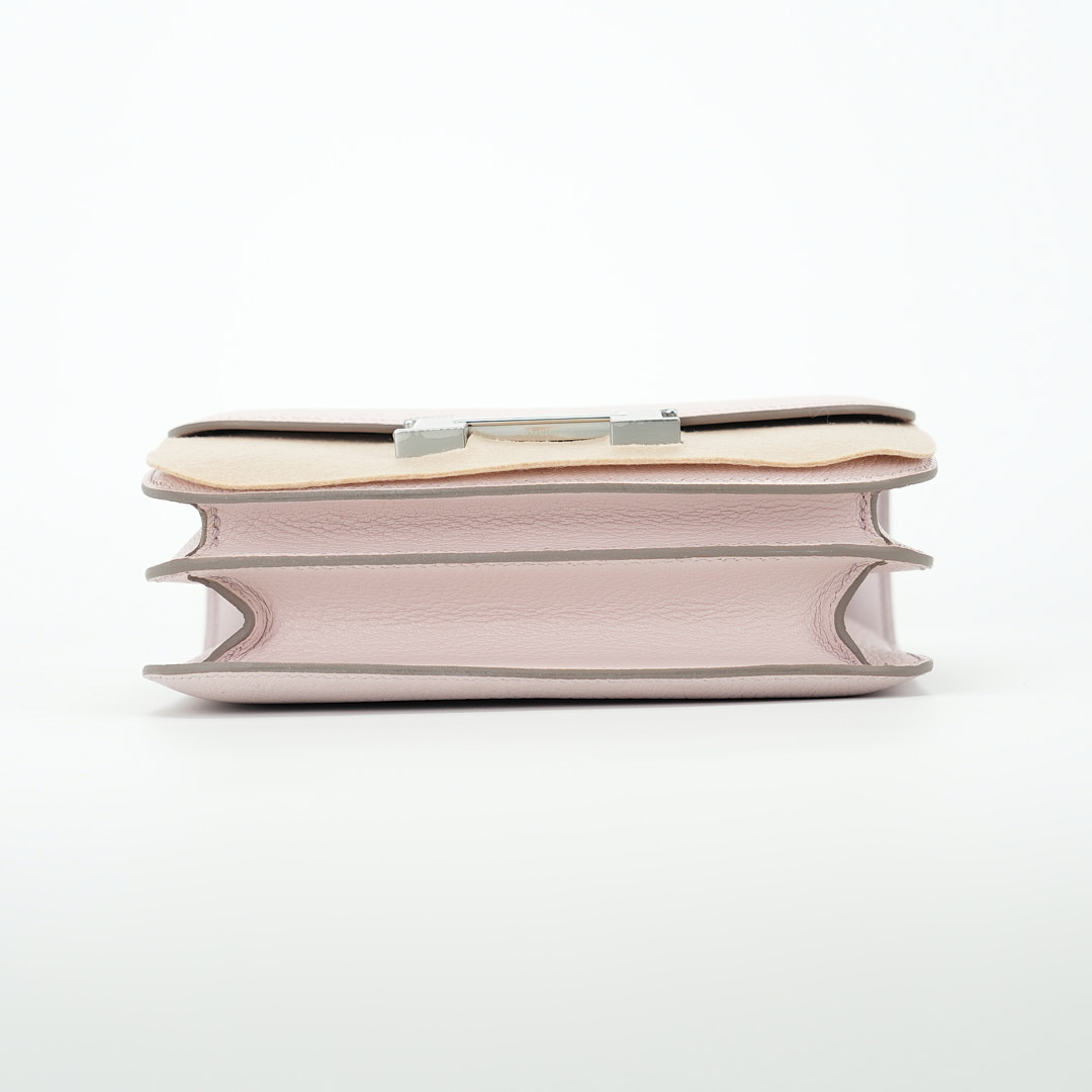 This Constance is in Rose Darling Chevre with palladium hardware, has tonal stitching, a metal “H” snap lock closure and adjustable shoulder strap. The interior is lined with Goat lambskin and has an open pocket on the front wall, a center divide.