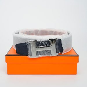 Iconic reversible belt in togo Bleu Nuit leather on one side and black leather on the other. The palladium buckle features the H logo for a statement look.
