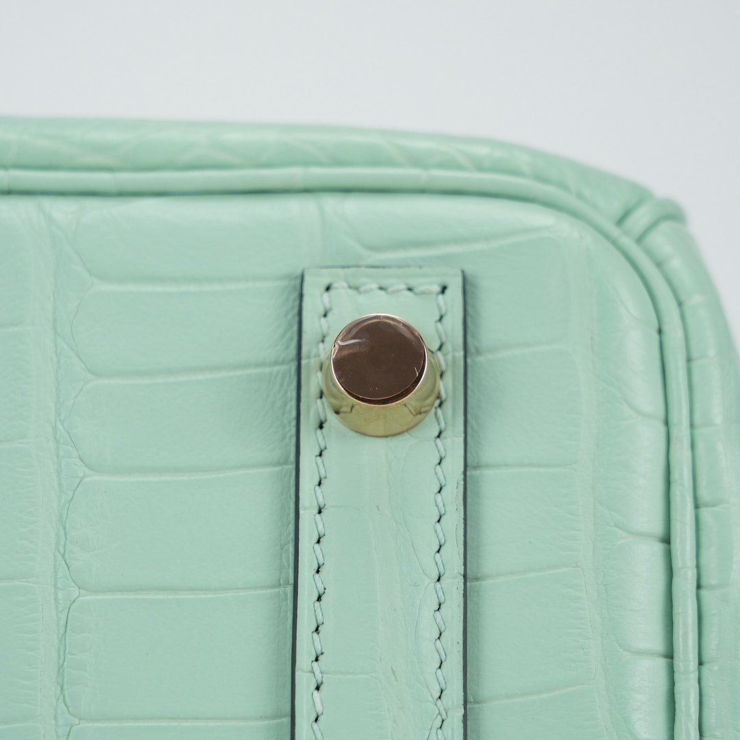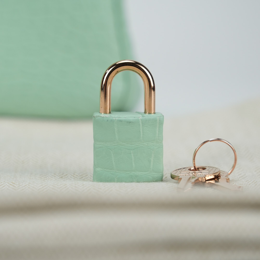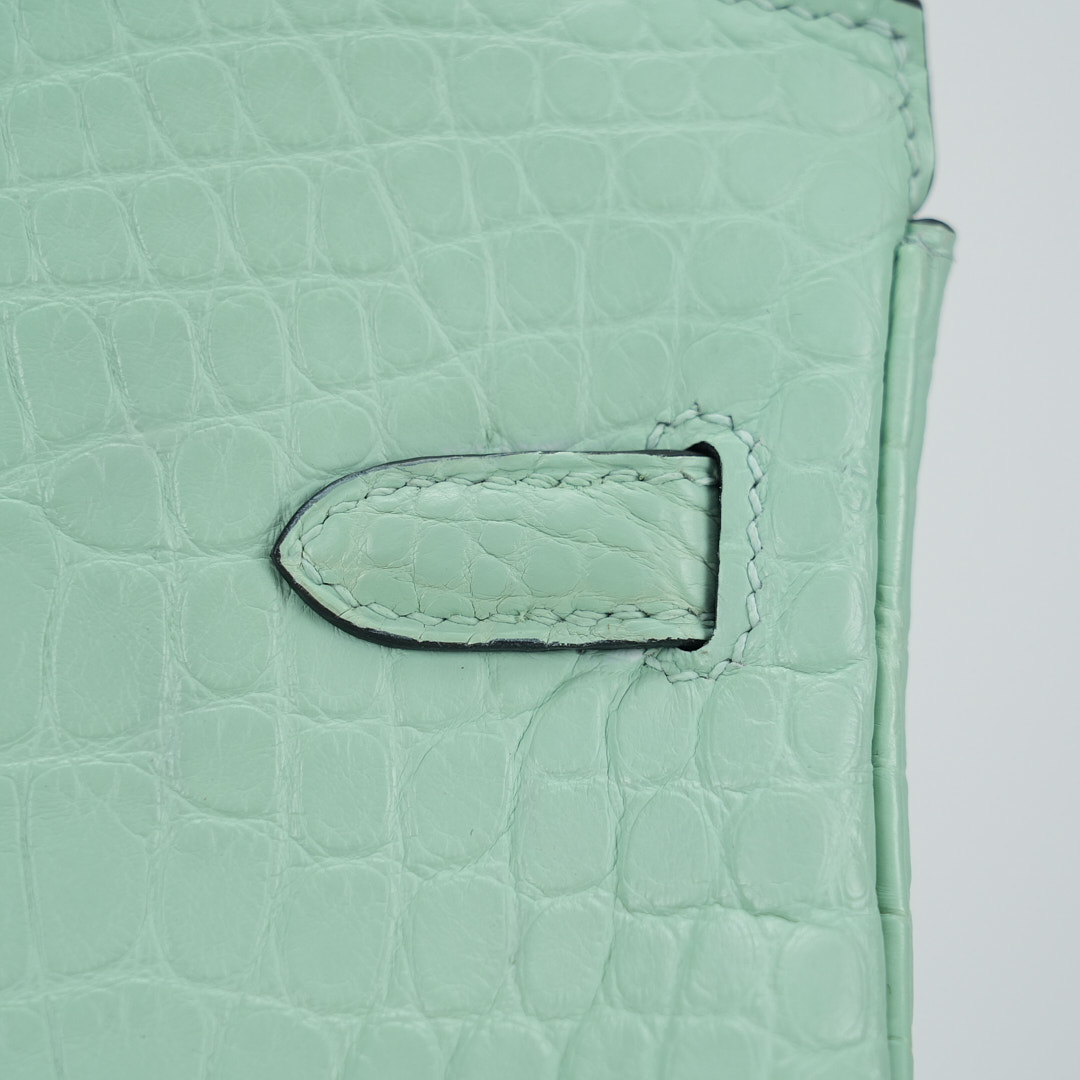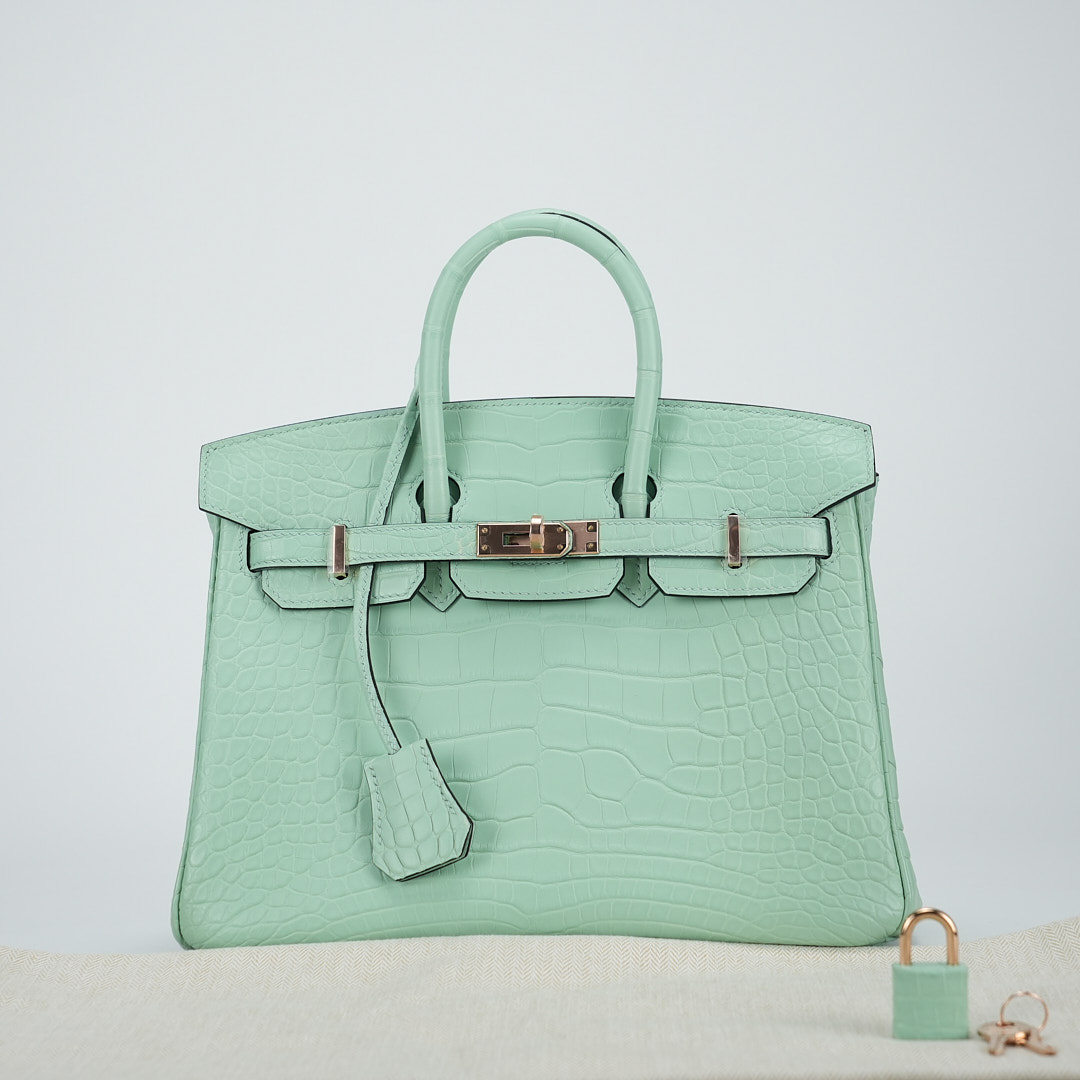 This BK is in Matte Alligator with Rose Gold hardware and has the same tonal stitching, front strap, two straps with center toggle closure, clochette with lock and two keys and double rolled handles.