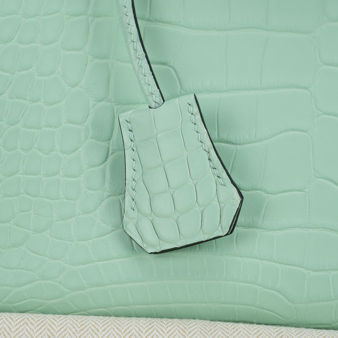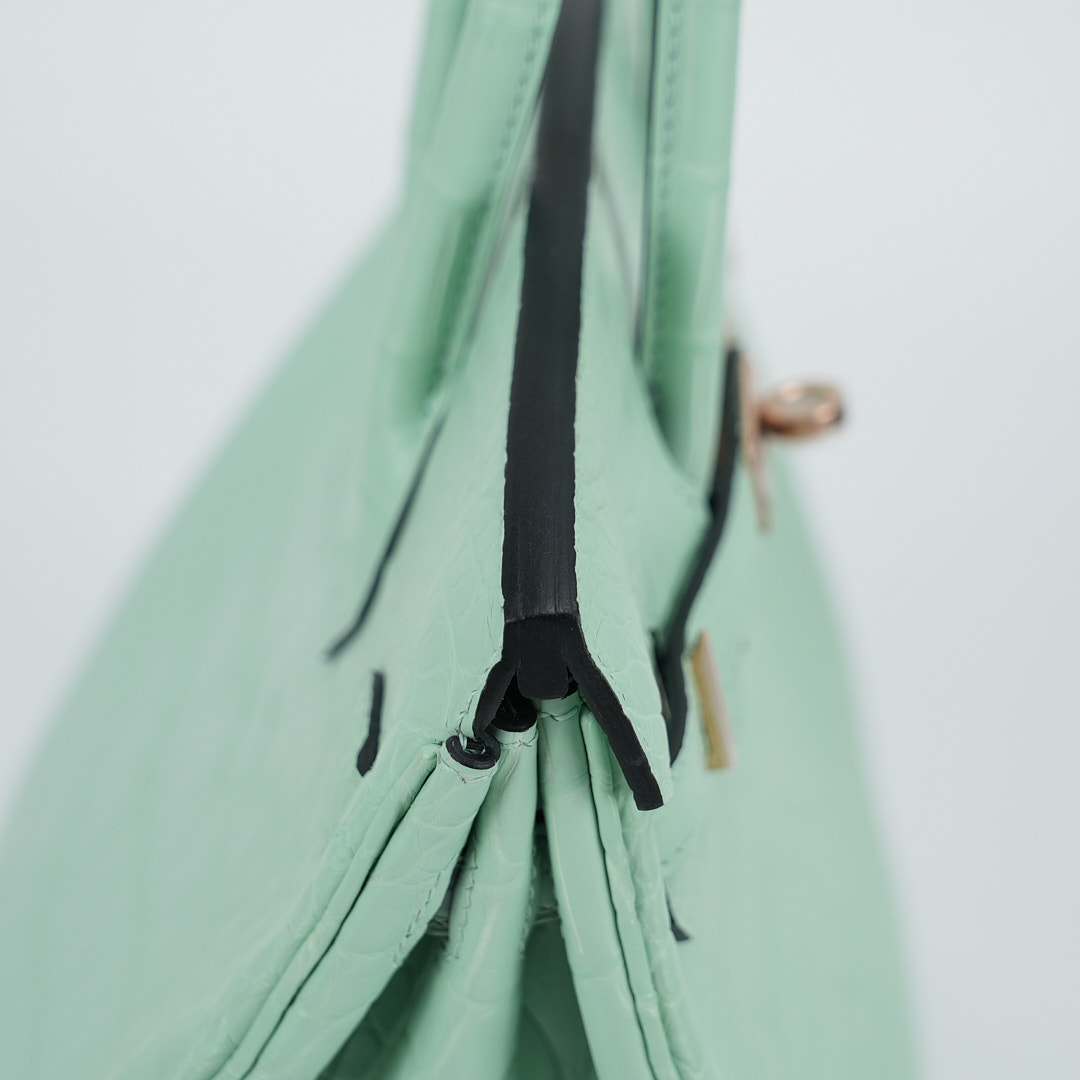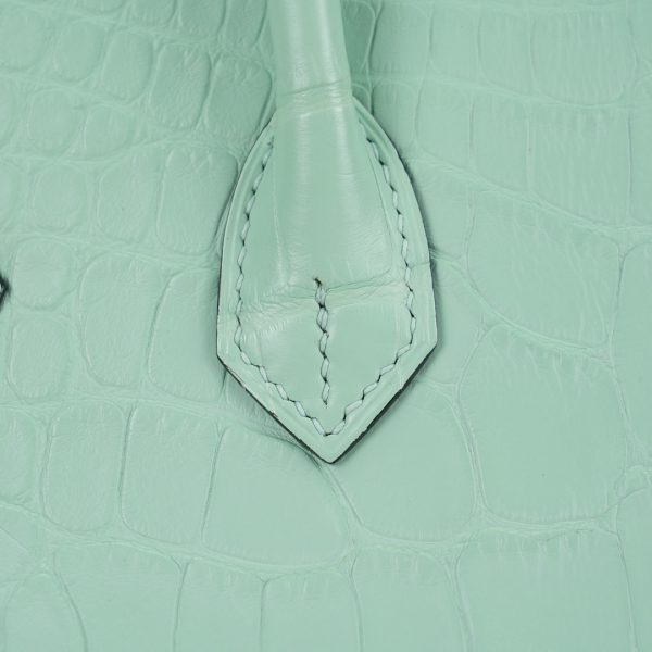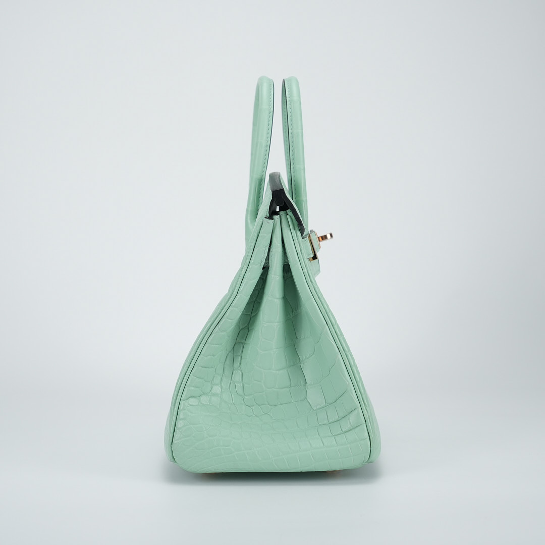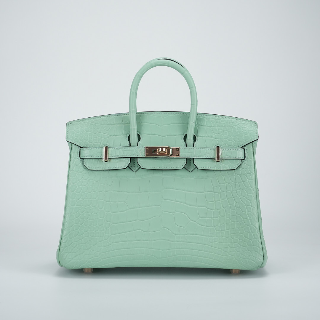 This BK is in Matte Alligator with Rose Gold hardware and has the same tonal stitching, front strap, two straps with center toggle closure, clochette with lock and two keys and double rolled handles.