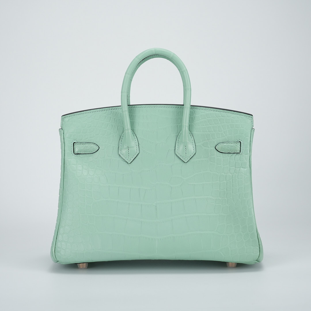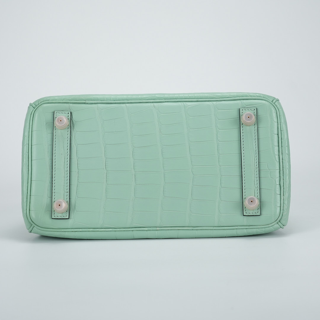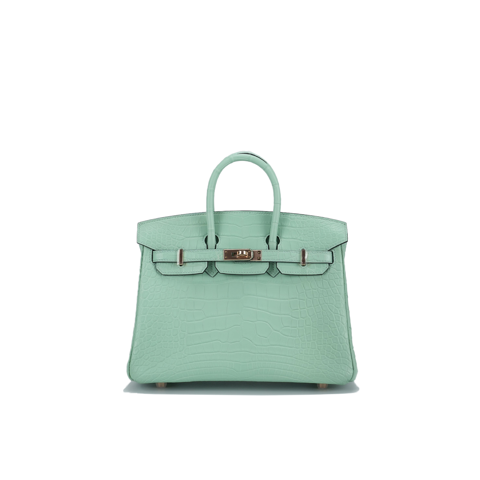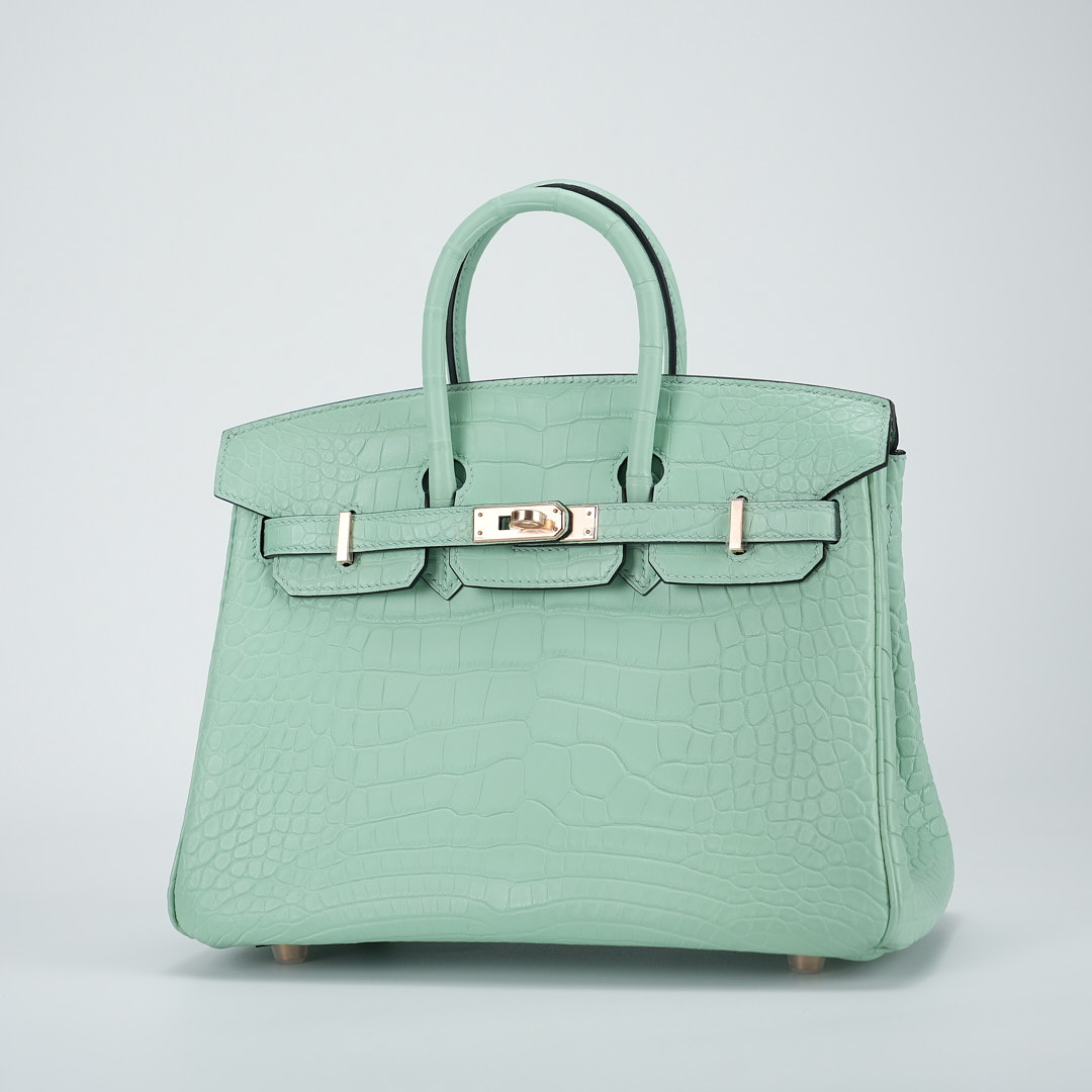 This BK is in Matte Alligator with Rose Gold hardware and has the same tonal stitching, front strap, two straps with center toggle closure, clochette with lock and two keys and double rolled handles.